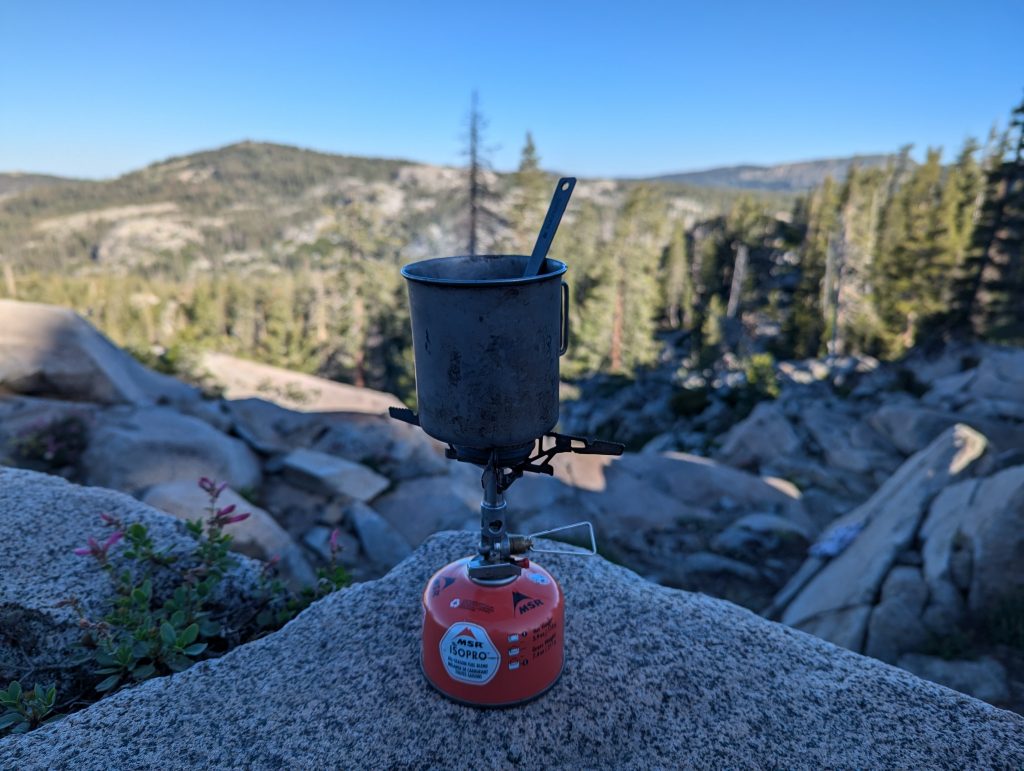 Es geht im Wald leicht bergauf und schon bald komme ich an einer Gesteinsformation mit einer schönen Sicht vorbei. Hier lege ich dann meine Frühstückspause ein und koche mir meinen Kaffee.