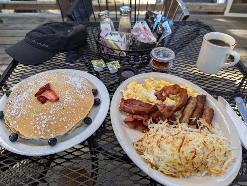 Dort gehe ich dann entspannt frühstücken. Heute gibt es ein Hiker-Frühstück, welches aus 3 Eiern, 3 Scheiben Bacon, 3 Würstchen, Kartoffeln und 3 Pfannkuchen besteht.