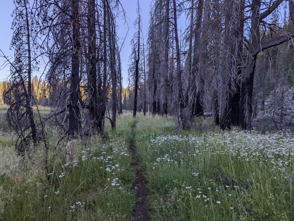 Weiter unten geht es dann kurz durch Graslandschaften und ich sehe bereits wieder die ersten abgebrannten Bäume.