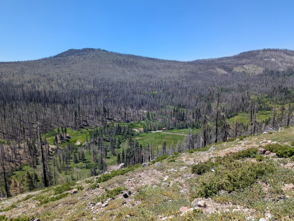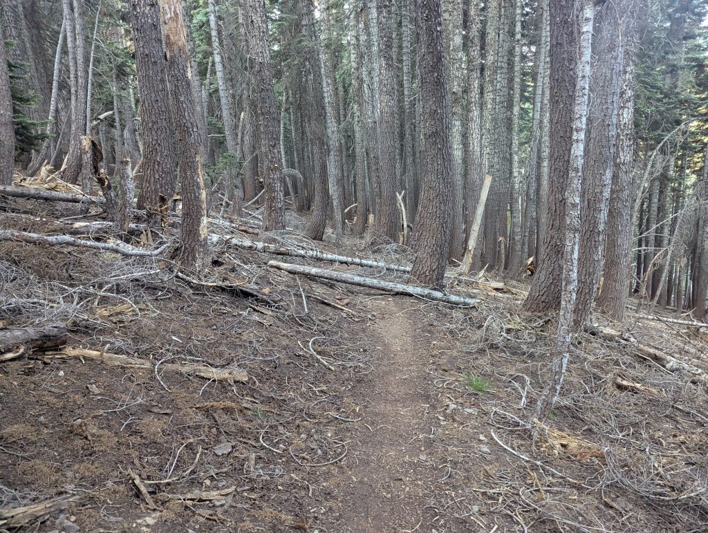 Ich gewinne etwas an Höhe und betrachte mir die Umgebung, welche im Gegensatz zum abgestorbenen Wald der letzten Tag doch um einiges schöner aussieht. Leider bleibt die Hitze erhalten und somit schwitze ich auch bei dem leicht zu laufenden Weg sehr. Bis zur nächsten Wasserstelle sind es aber noch knapp 10 Meilen, die ich heute noch absolvieren muss.