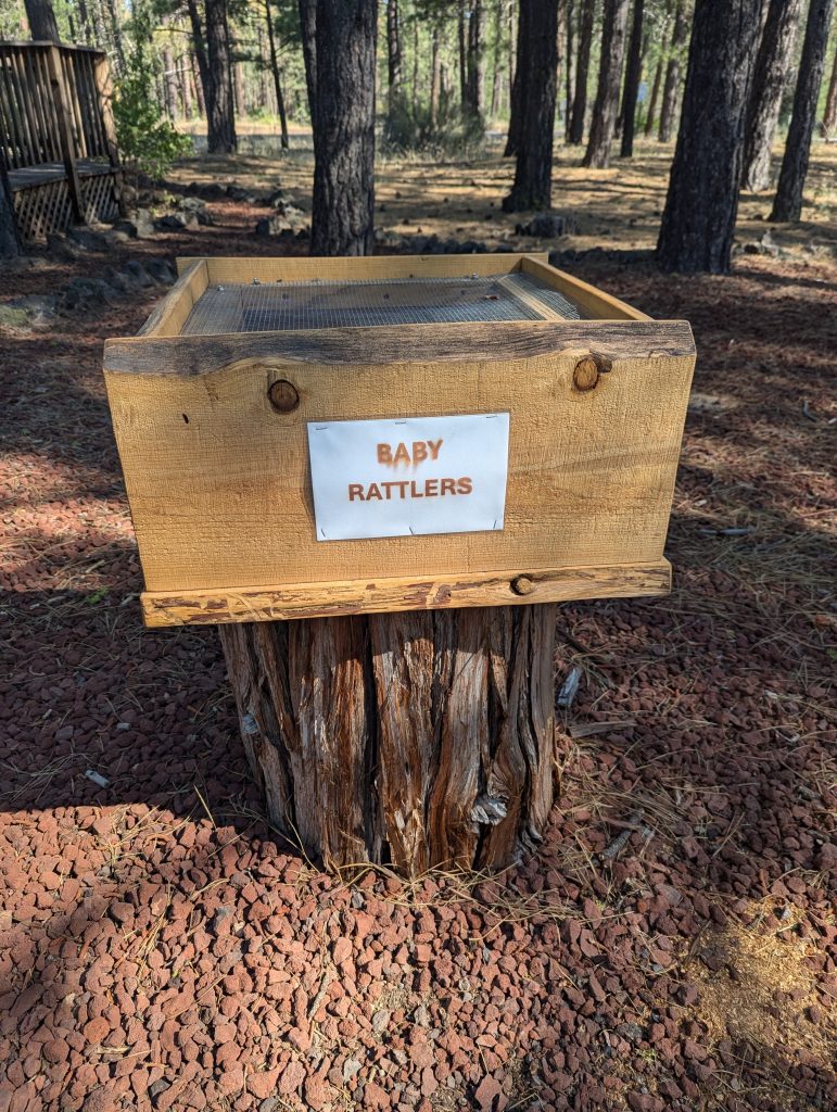 Danach laufe ich an einer Rangerstation vorbei, wo es anscheinend Babyklapperschlangen zu sehen gibt. Bei einem Blick in den Kasten muss ich dann doch schmunzeln und freue mich, dass die Ranger hier einen Sinn für Humor haben.