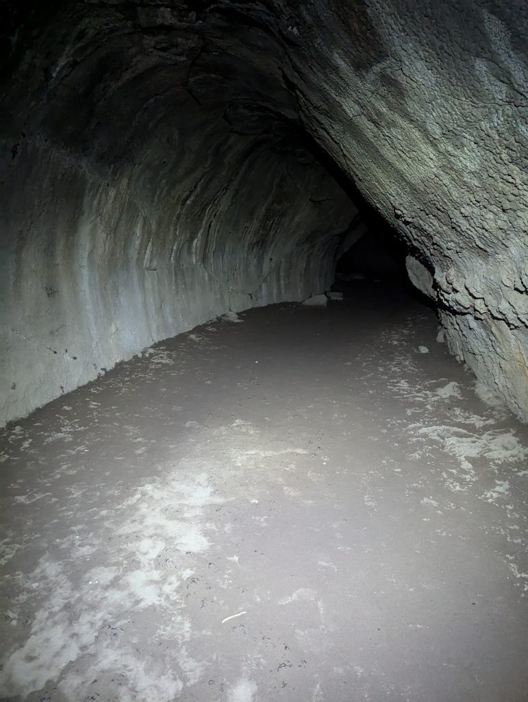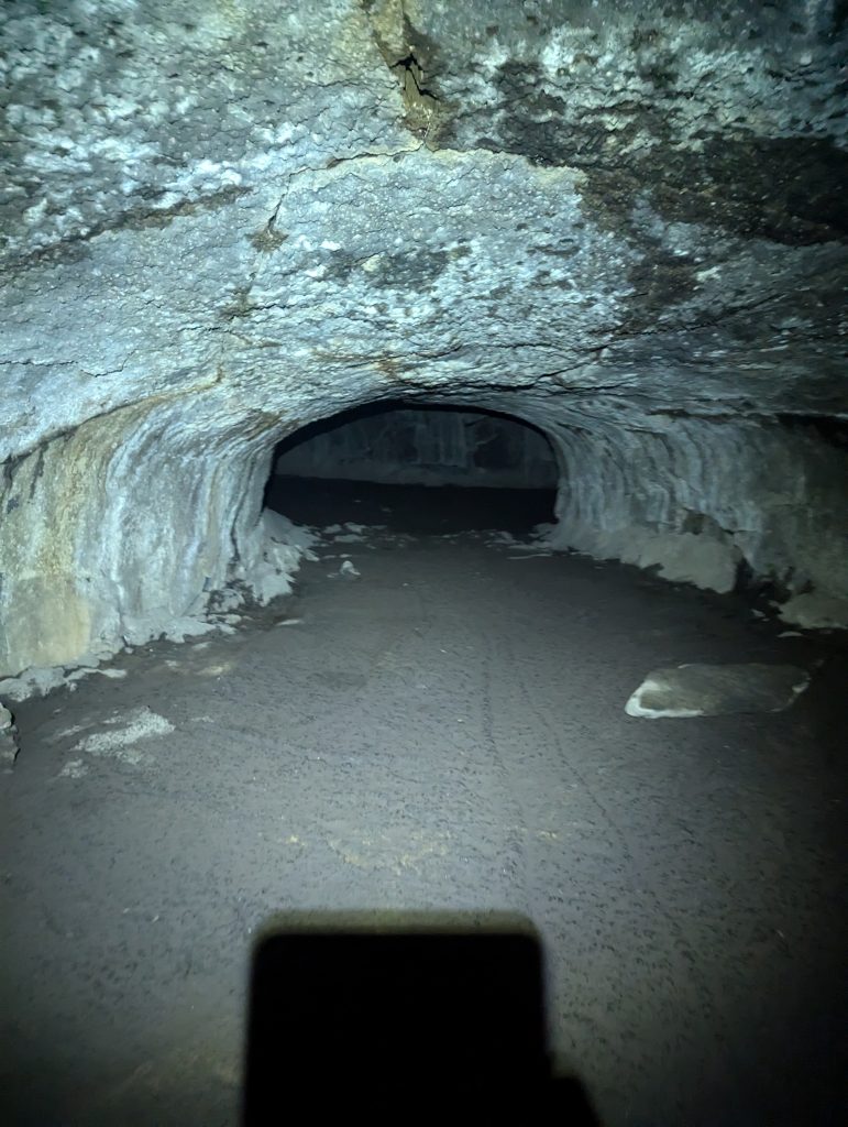 Ich laufe weiter zu einer Lavahöhle, welche ich mir dann von innen anschaue. Der ehemalige Lavastrom hat hier eine tolle Höhle geformt, in der es angenehm kühl ist. Mit Stirnlampe laufe ich durch den langen Tunnel und betrachte mir alles. Als ich damit fertig bin, fülle ich an einem Brunnen mein Wasser auf und mache mich wieder auf den Weg.