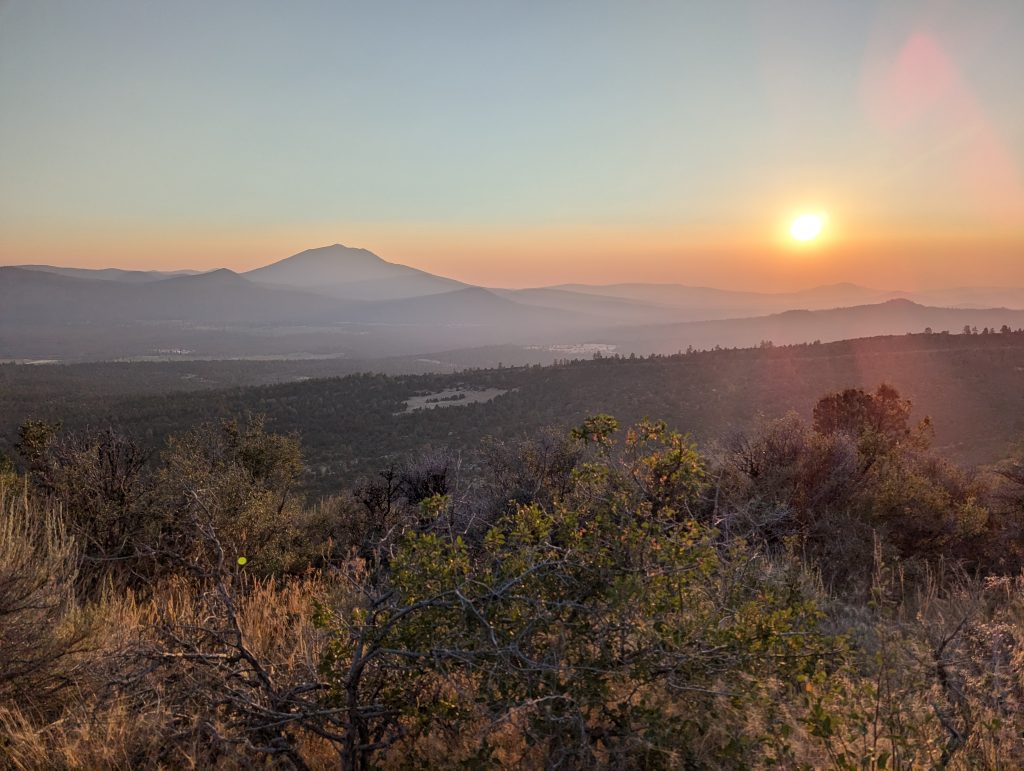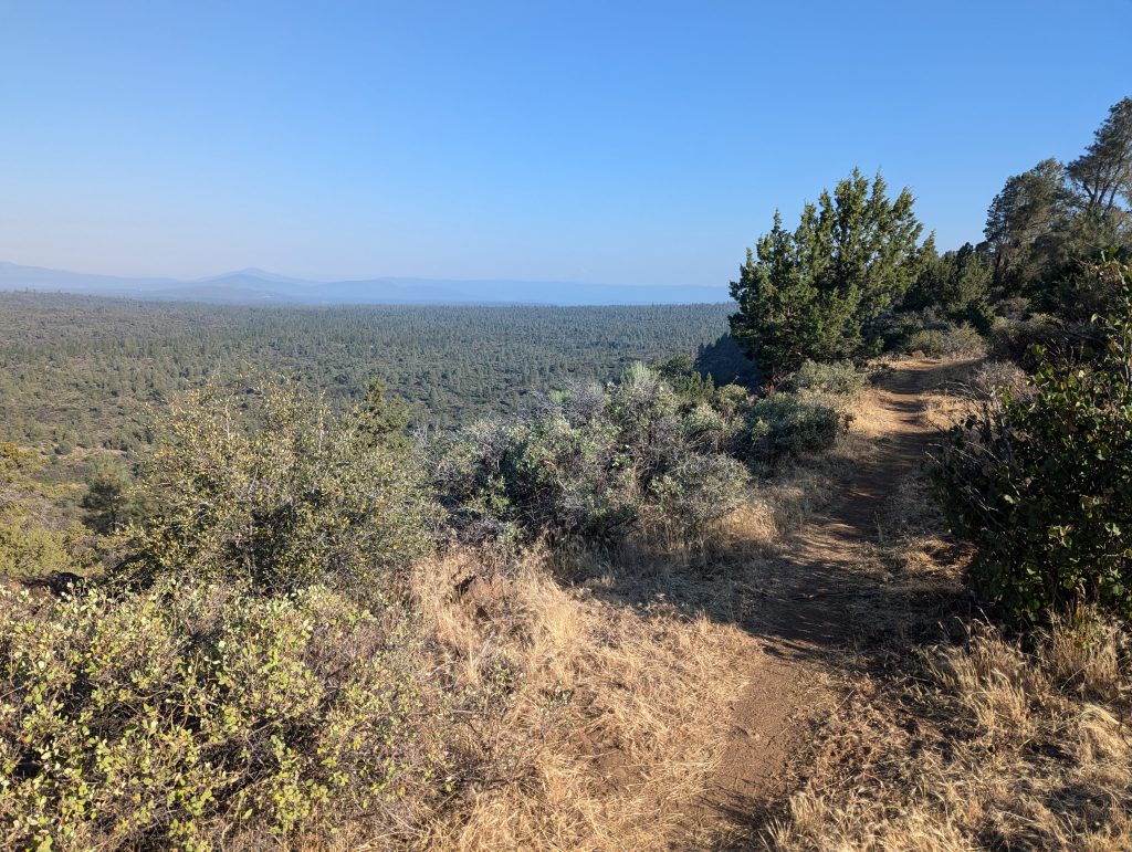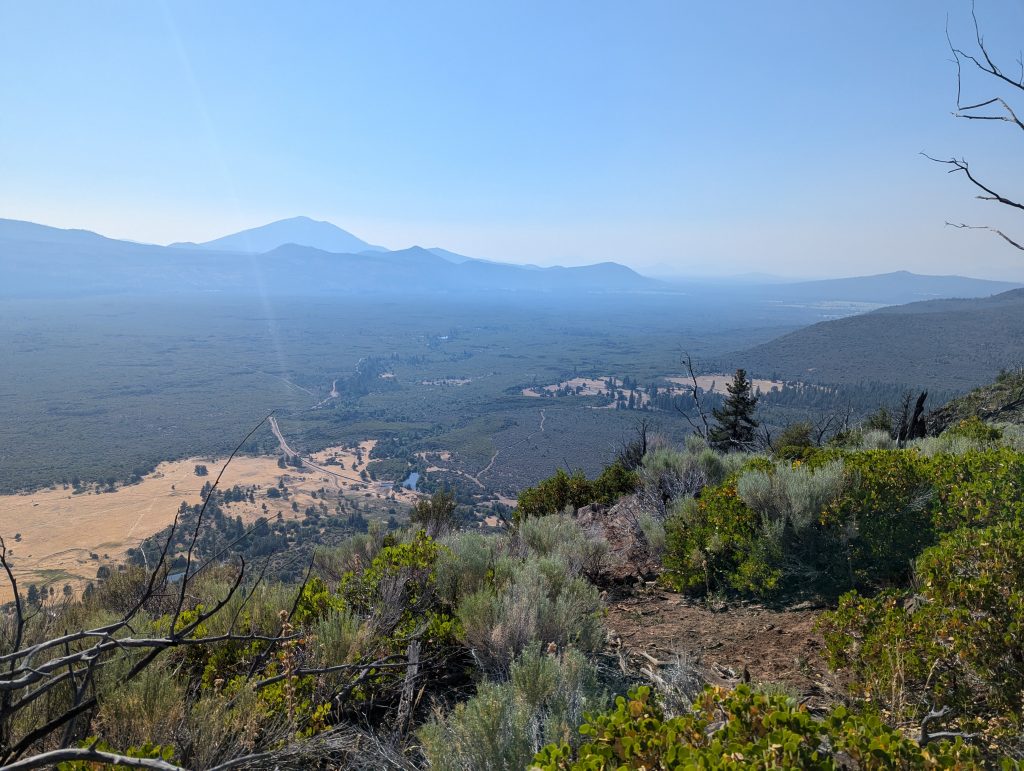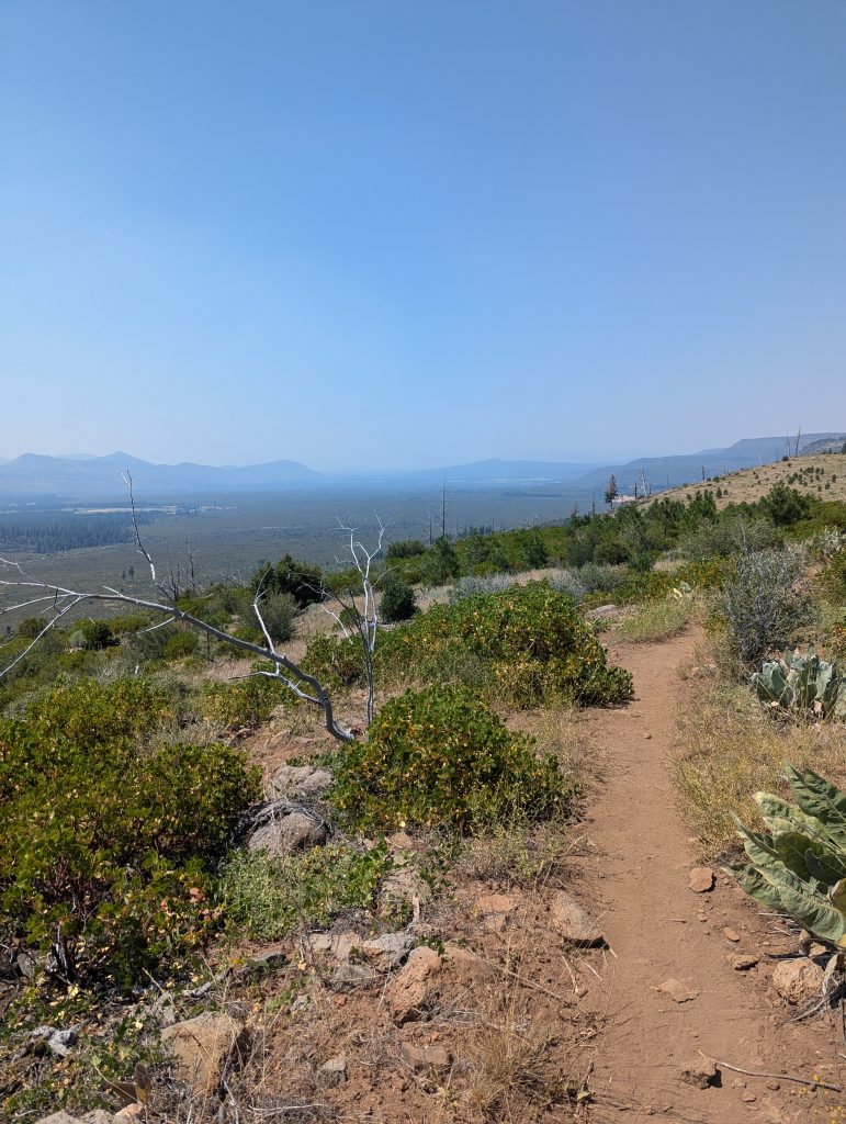 Mittlerweile ist es fast 12 Uhr und ich muss in der brennenden Mittagssonne den Berg hinauf. Immerhin ist der Anstieg nicht besonders lang und von oben habe ich einen guten Blick auf die Umgebung, auch wenn die Sicht durch den Rauch der Waldbrände in der Umgebung sehr getrübt ist.