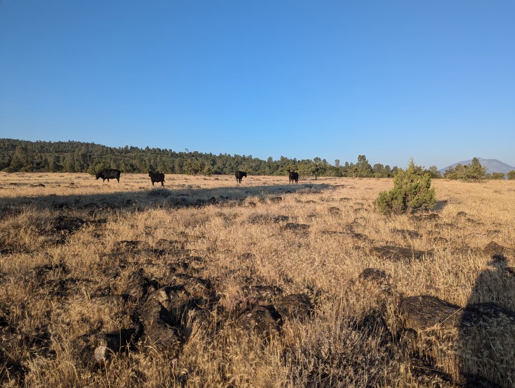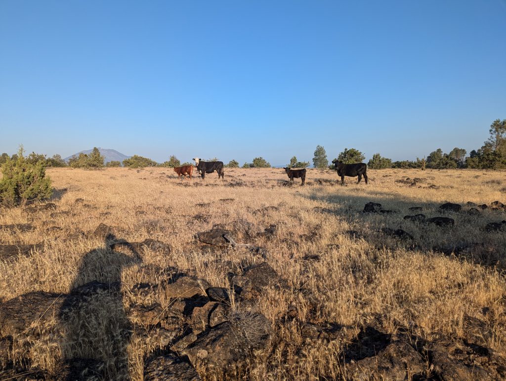 Ich laufe einige Meilen durch die Gegend, bevor ich auf einmal auf einer Kuhweide unterwegs bin. Auch wenn das Gras sehr trocken wirkt, treffe ich einige Rinder an, die hier gerade essen und mich interessiert beobachten.