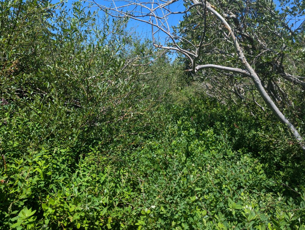 Zwischendrin muss ich mich aber ab und an durch einen sehr zugewachsenen Weg kämpfen. Die Büsche sind so dicht, das der Weg selbst kaum zu sehen ist. Trotzdem kann ich einigermaßen gut erkennen, wo es weitergeht.