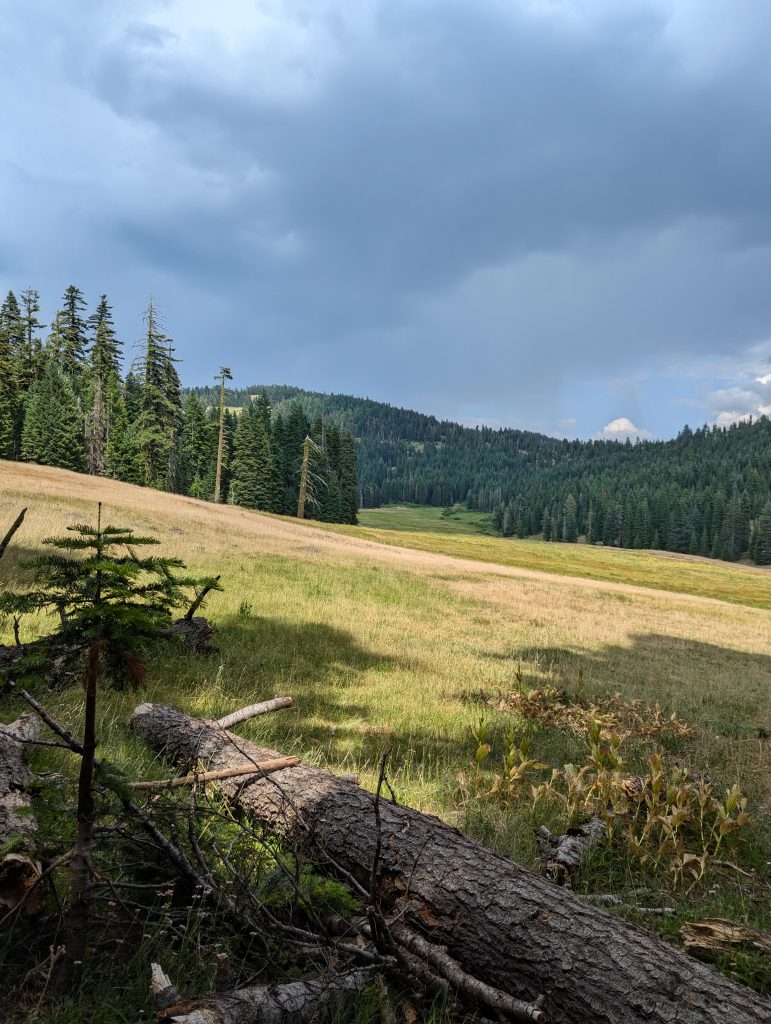 Der Weg führt mich immer weiter hinauf, wobei ich auch am Morgen wieder mit einigen umgefallen Bäumen zu kämpfen habe. Somit wird der Anstieg dann doch anstrengend. Ich komme an Wiesen vorbei und laufe fast den ganzen Morgen bergauf.