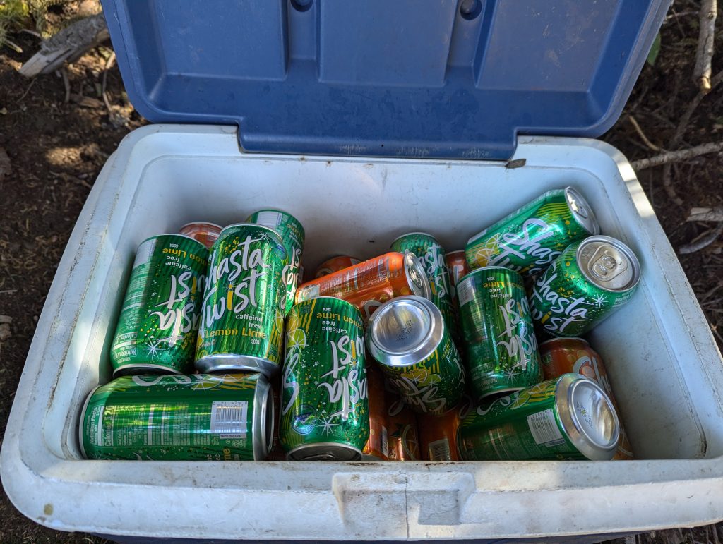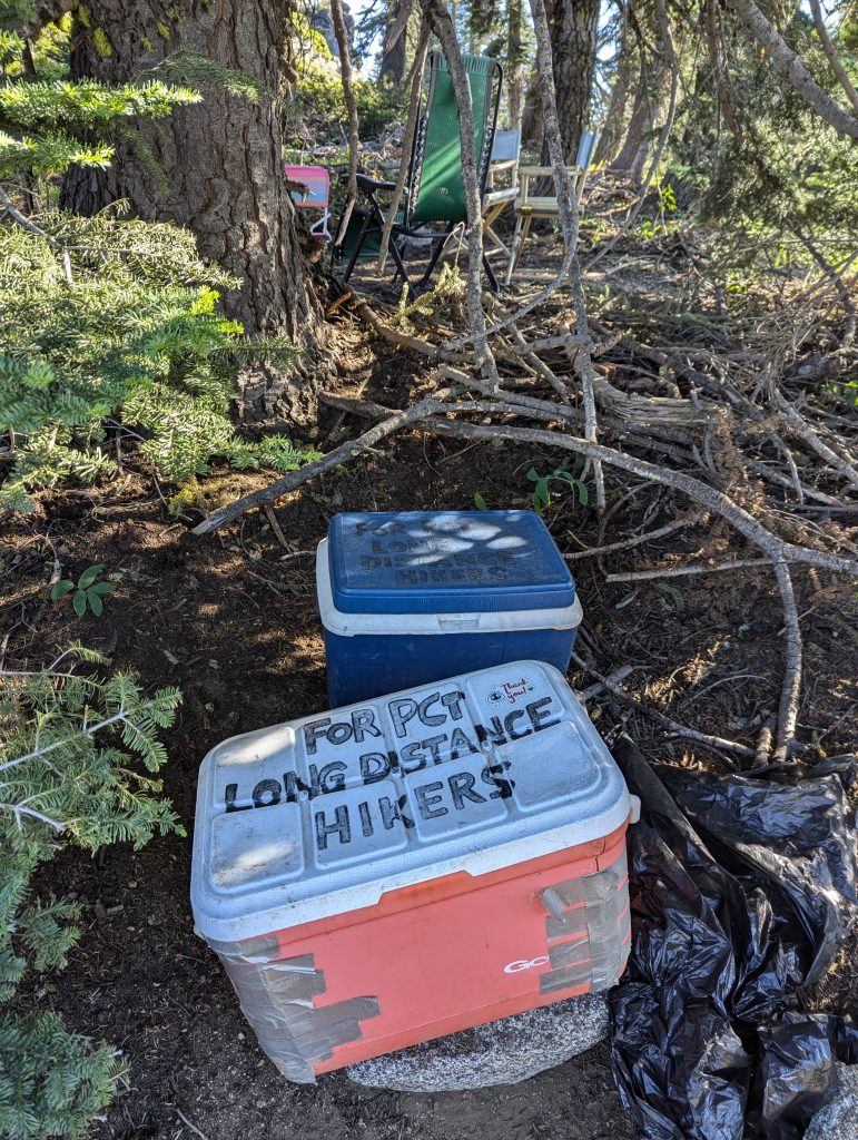 Nachdem ich bei einer kurzen Trinkpause die Aussicht genossen habe, laufe ich etwa 10 Minuten und treffe dann auf Kisten voller Soda, welche extra für PCT Hiker hier abgestellt worden sind. Also mache ich erneut Halt und trinke eine Zitronenlimonade.