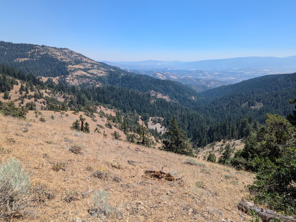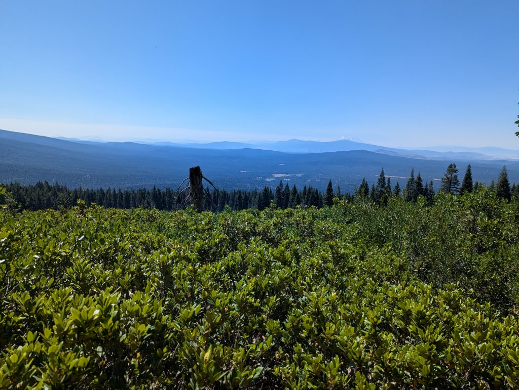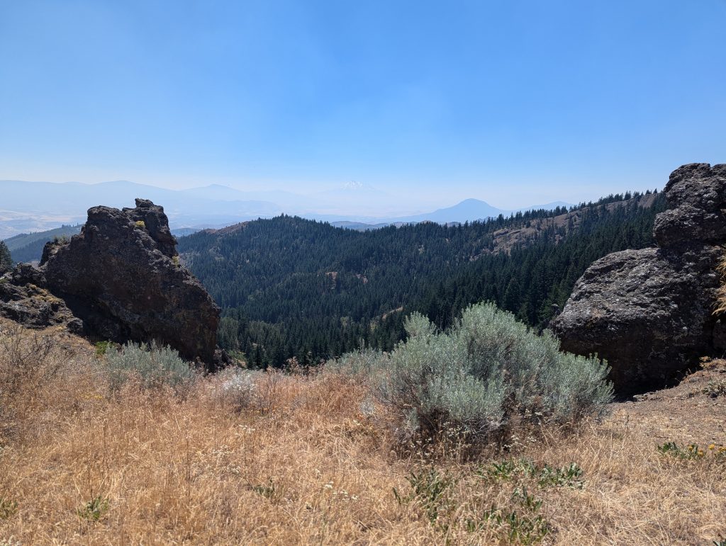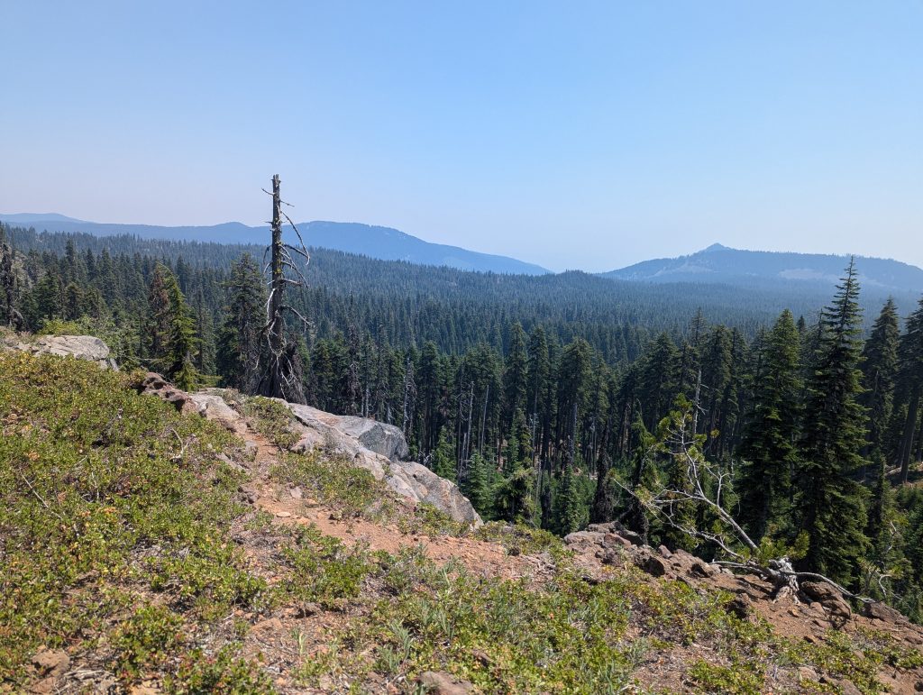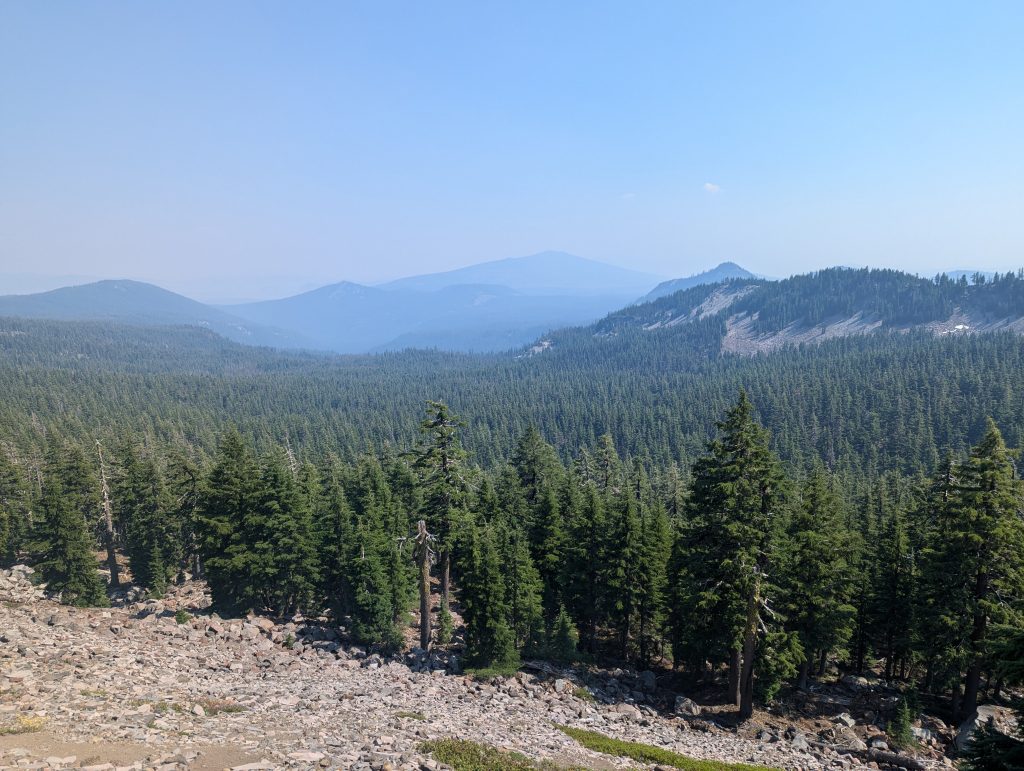 Danach laufen wir gegen 11 Uhr los. Auch wenn mir häufiger berichtet wurde, dass Oregon sehr flach sei, geht es doch erstmal eine ganze Weile bergauf. Lange Zeit bin ich dabei im Wald unterwegs und zwischendrin gibt es auch freie Stellen, von wo aus ich nochmals einen Blick auf den Mount Shasta werfen kann, welcher aber etwas im Rauch der Feuer der Umgebung verschwindet.