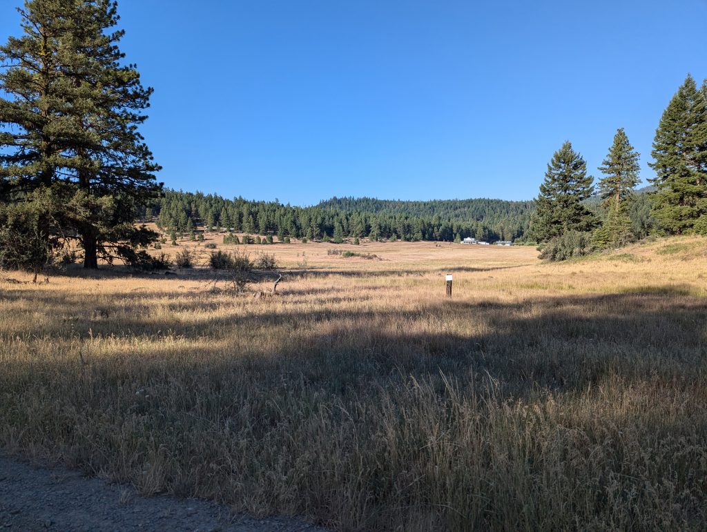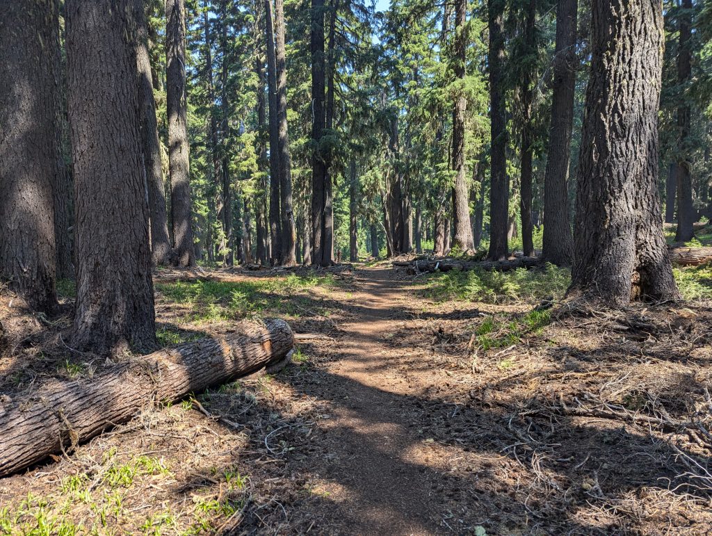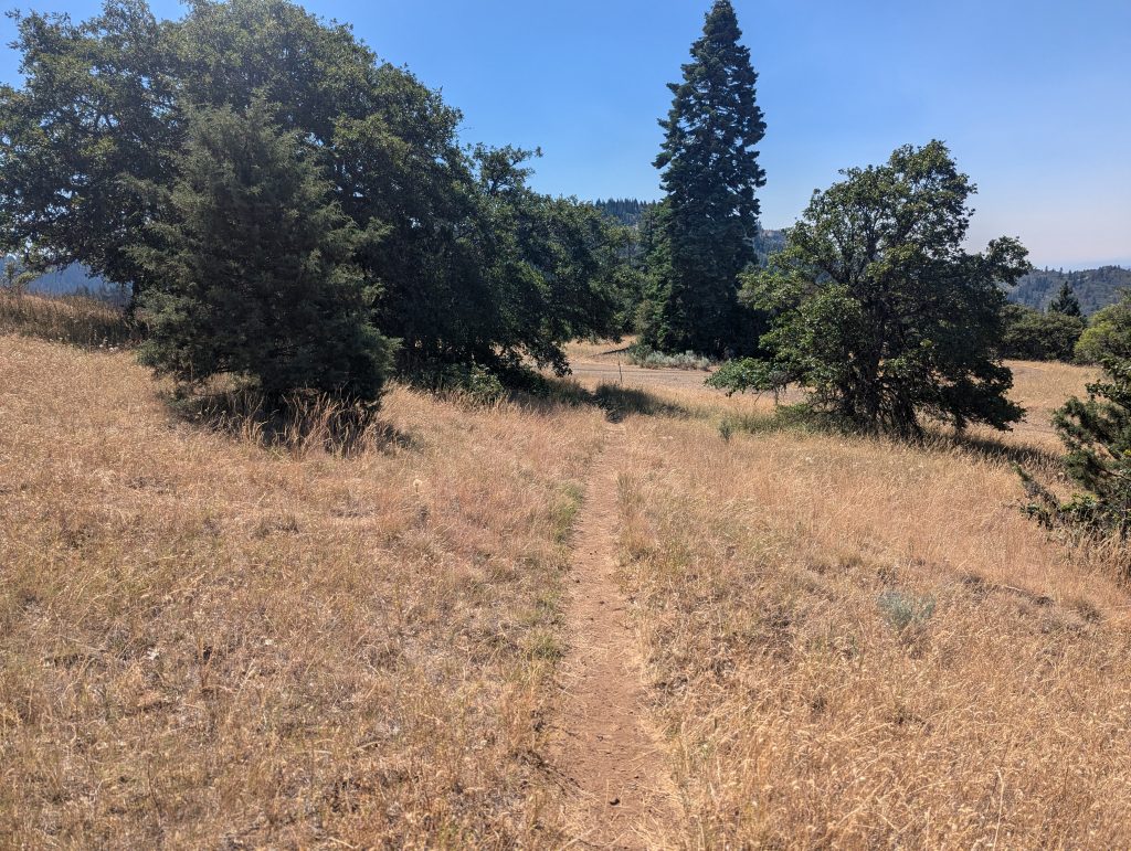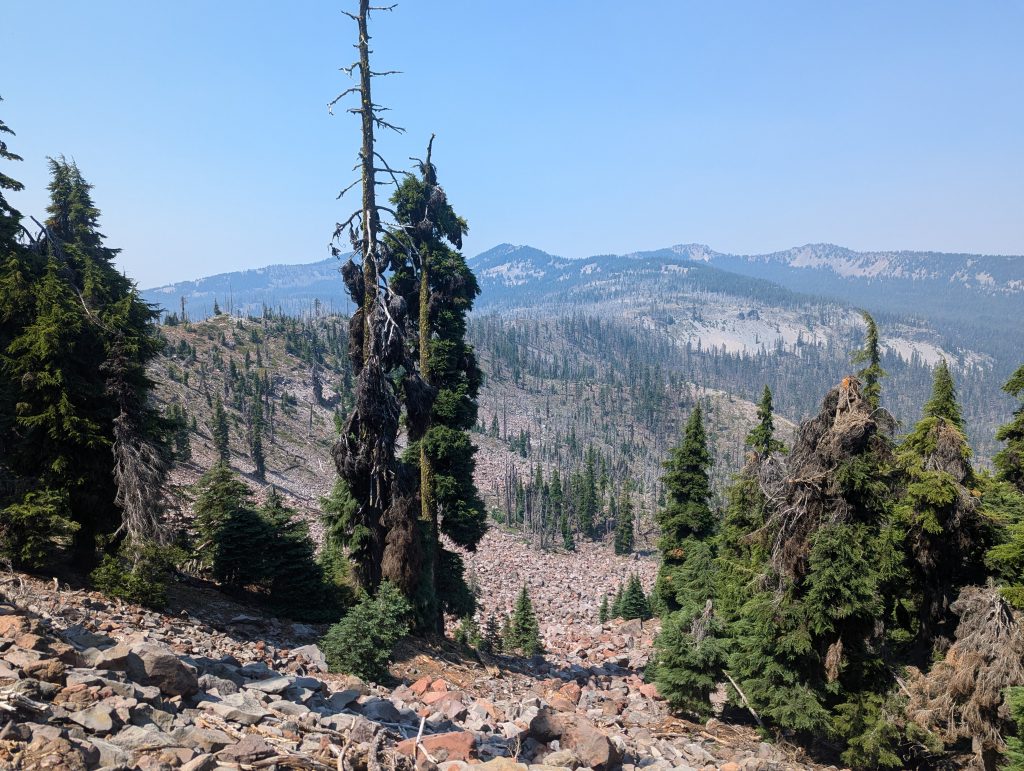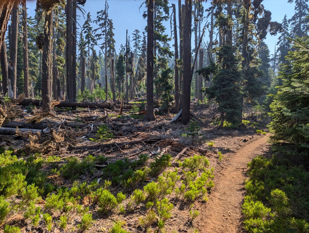 Danach laufen wir gegen 11 Uhr los. Auch wenn mir häufiger berichtet wurde, dass Oregon sehr flach sei, geht es doch erstmal eine ganze Weile bergauf. Lange Zeit bin ich dabei im Wald unterwegs und zwischendrin gibt es auch freie Stellen, von wo aus ich nochmals einen Blick auf den Mount Shasta werfen kann, welcher aber etwas im Rauch der Feuer der Umgebung verschwindet.