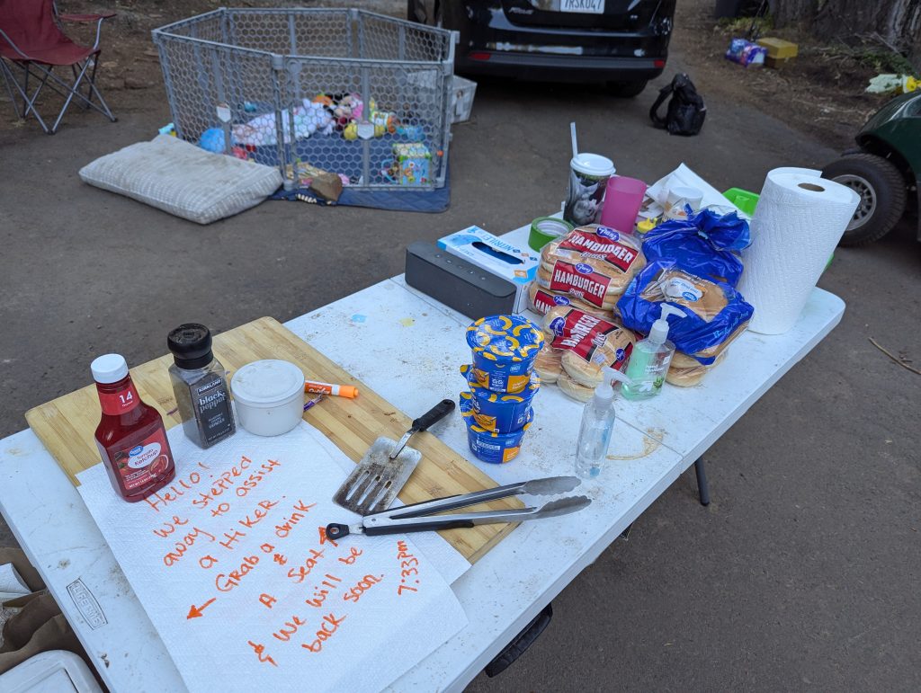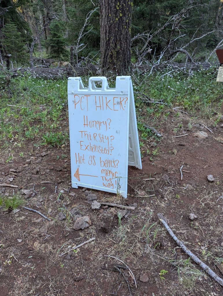 Zuerst hatte ich mir überlegt hier zu zelten, entscheide mich dann aber doch dazu weiter zu gehen, was eine gute Entscheidung gewesen sein soll. Denn etwas später sehe ich ein Schild mit Trail Magic. Leider sind die Leute gerade nicht da und somit trinke ich nur eine Soda, auch wenn das Essen sehr lecker aussieht.
