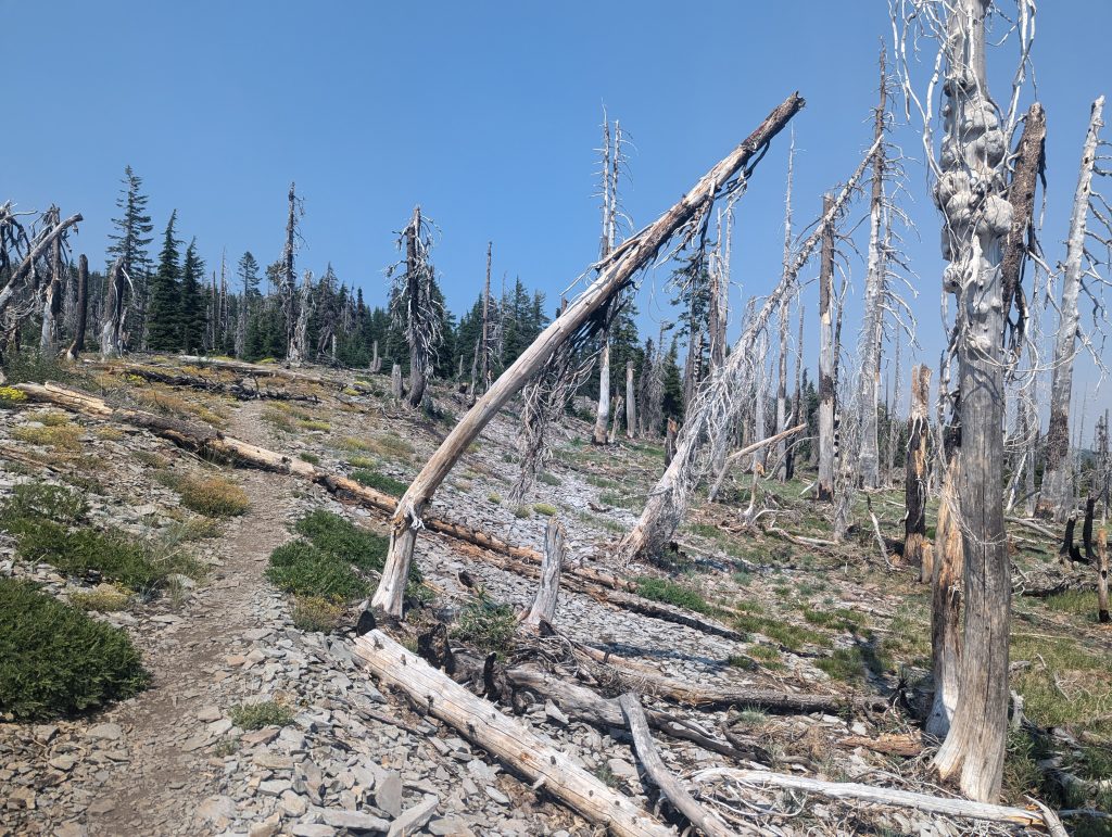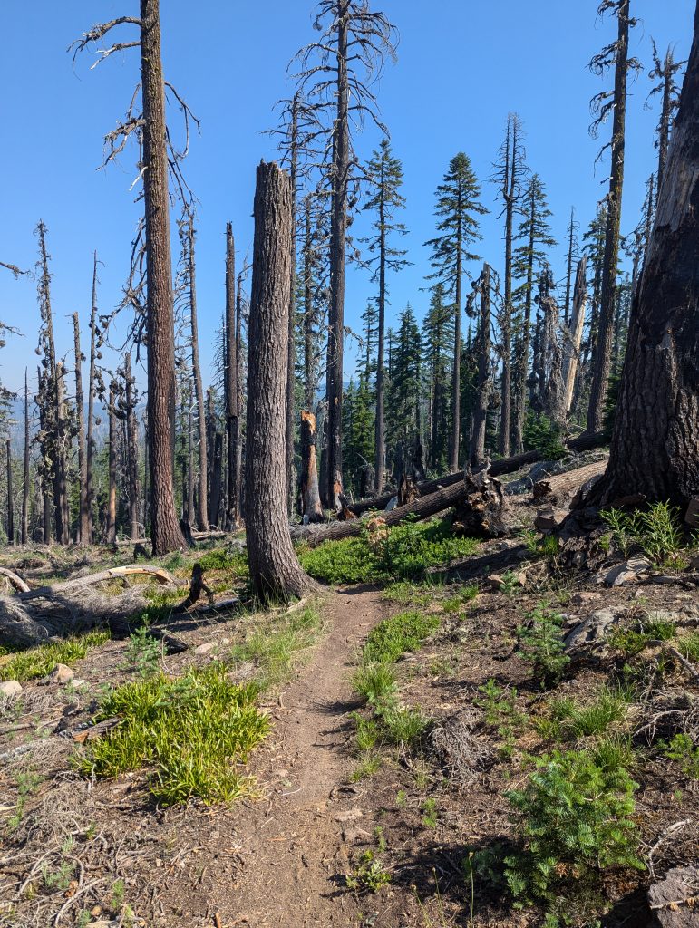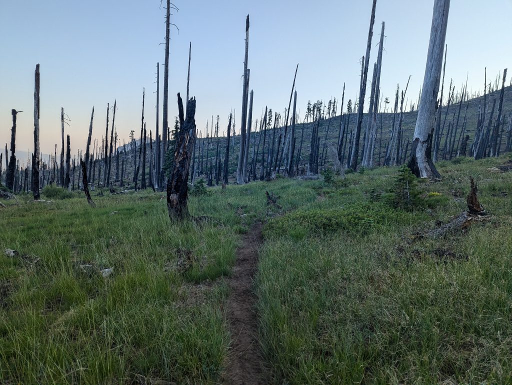 Danach geht es längere Zeit bergab. Teilweiße laufe ich am Hang entlang und kann neben mir Meilen weit abgebrannten Wald begutachten. Leider geht es auch für mich weiter durch abgebrannte Bäume, wodurch ich der Sonne direkt ausgesetzt bin.