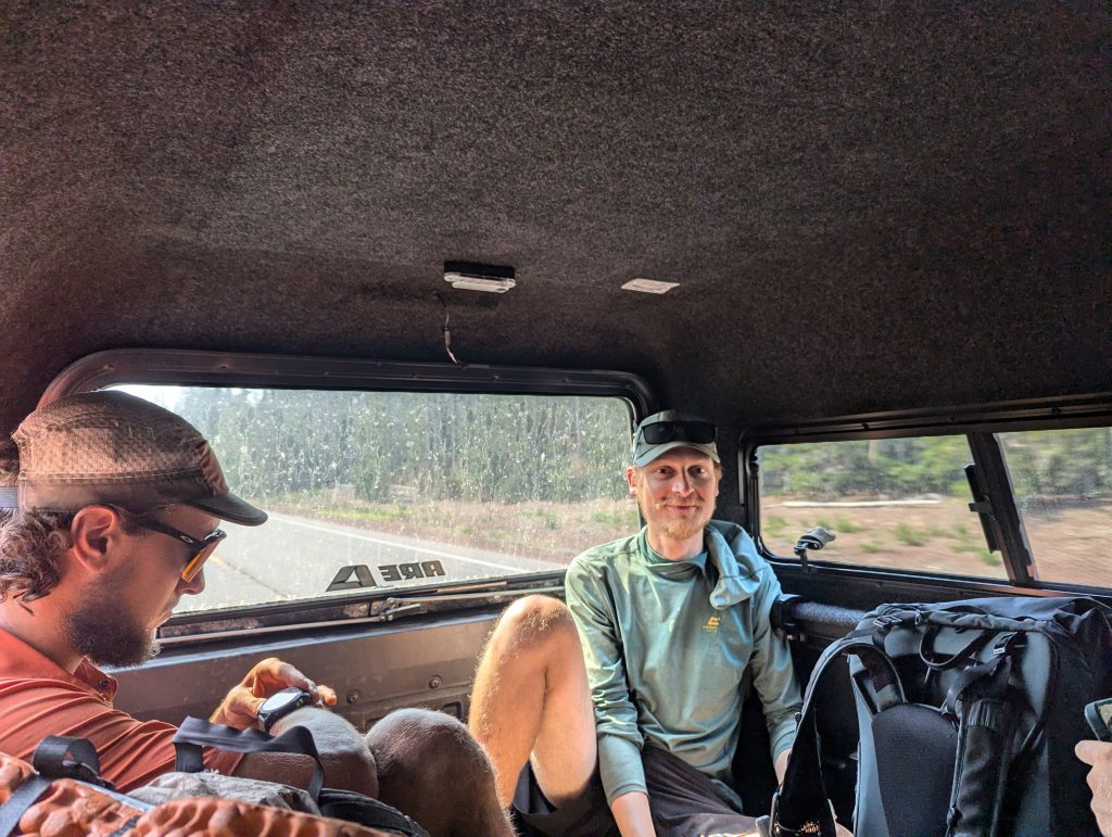 Kurz nach 15 Uhr erreiche ich nach 38 km eine Straße. Von hier aus muss ich nun leider wieder mit dem Auto weiter, um ein Feuer vor mir zu umgehen. Zusammen mit drei anderen Hikern geht es bald im Auto in das nächste Dorf. Dort müssen wir umsteigen.