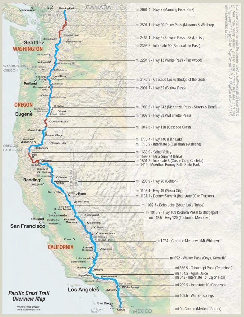 Aufgrund verschiedener Feuer musste ich leider immer wieder kleinere und größere Abschnitte auf dem PCT überspringen. Das erste Mal musste ich von Mt Shasta (Meile 1498) bis nach Seiad Valley (Mile 1653) ein Feuer umfahren und habe dadurch 155 Meilen ausgelassen. In Oregon ging es dann 59 Meilen von Crater Lake (Meile 1845) bis nach Shelter Cove (1904). Als letztes habe ich dann noch ein größeres Stück vom Stevens Pass (Meile 2461) bis zum Harts Pass (Meile 2619) und somit weitere 158 Meilen übersprungen. Insgesamt musste ich also 372 Meilen auslassen und habe dadurch nur 2273 Meilen auf dem PCT absolviert, was lediglich 85% des ganzen Trails sind. Dies erklärt in gewisser Weise auch, warum ich nach weniger als 4 Monaten bereits in Kanada angekommen bin, obwohl ich eigentlich 4,5-5 Monate eingeplant hatte. Folgend nochmals die Übersichtskarte, wo gut zu sehen ist, welche Abschnitte ich überspringen musste:
