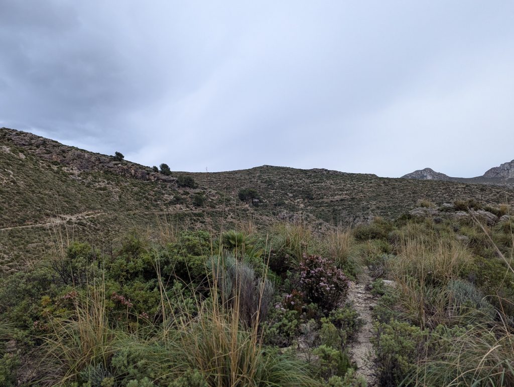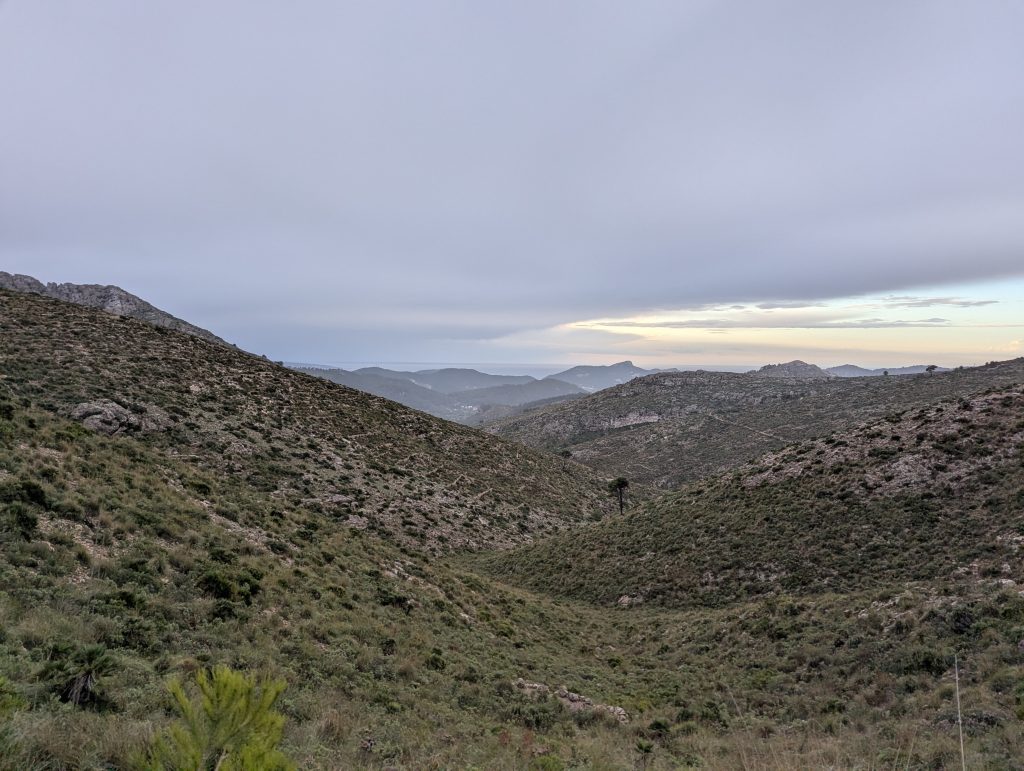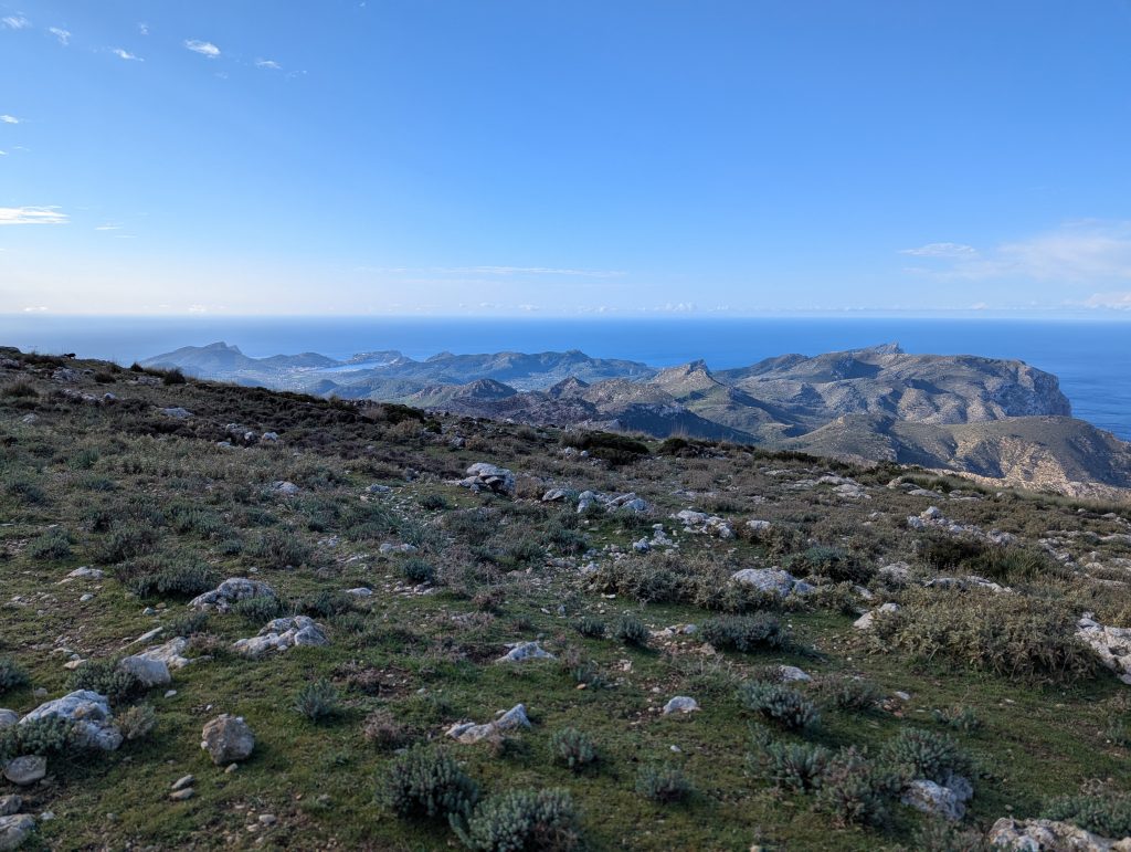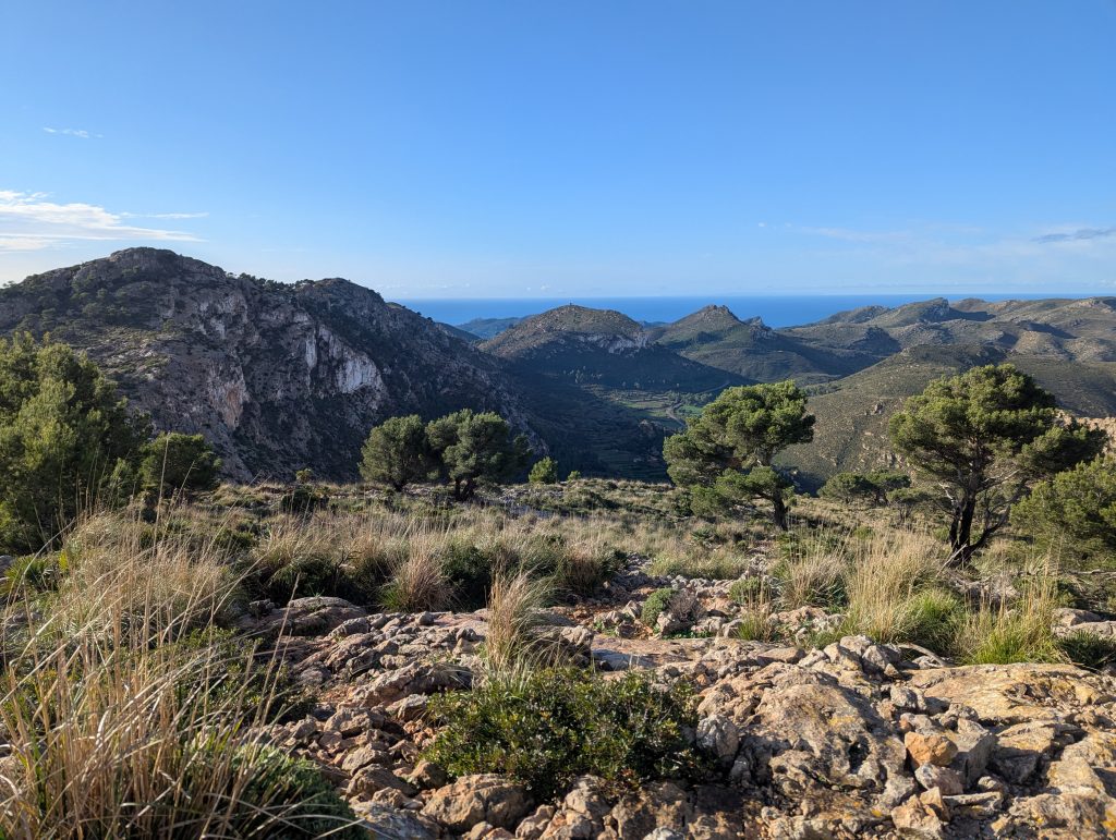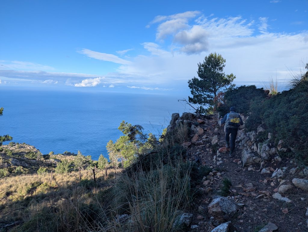 Bei schönstem Sonnenschein laufe ich auch direkt los. Bereits nach wenigen Minuten treffe ich auf Achat, einen anderen Wanderer der in Valencia lebt, in Kirgisistan geboren und in Russland aufgewachsen ist (wenn ich es richtig in Erinnerung habe). So wie ich, hat auch er vor im Zelt zu übernachten, aber im Gegensatz zu mir, muss er bereits am Sonntag Abend heim und somit hat er ein etwas stressigeres Programm als ich. Da wir das gleiche, schnelle Tempo haben (wir starten auch heute wieder mit 5km/h), laufen wir die nächsten Stunden zusammen. Es geht direkt leicht den Berg hinauf und schon bald bekommen wir einen ersten Blick auf das Meer.