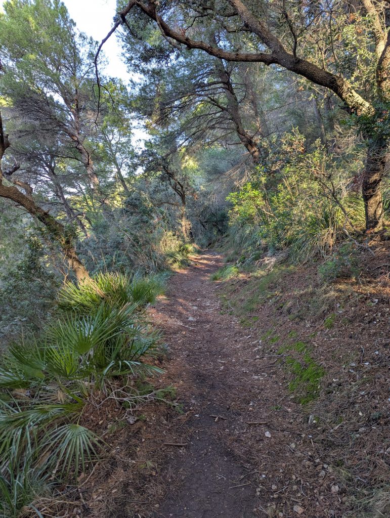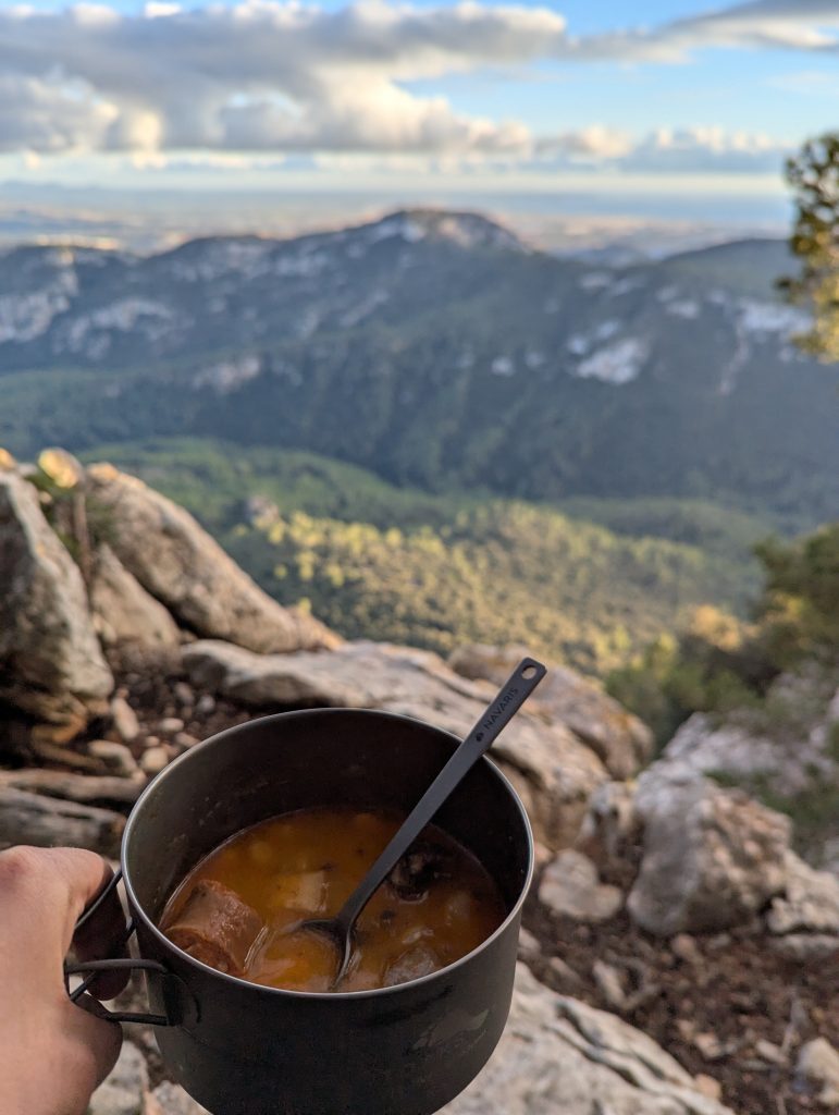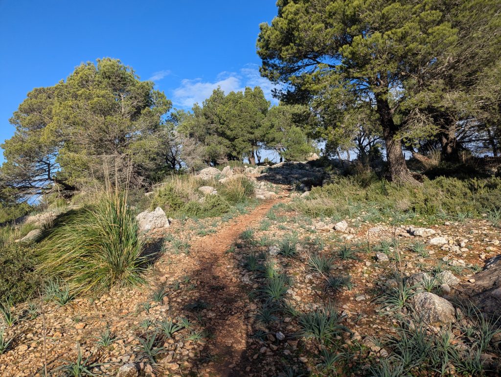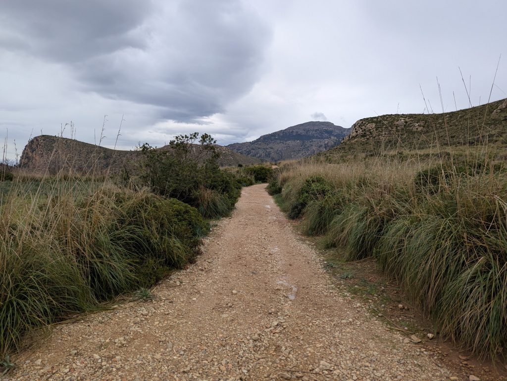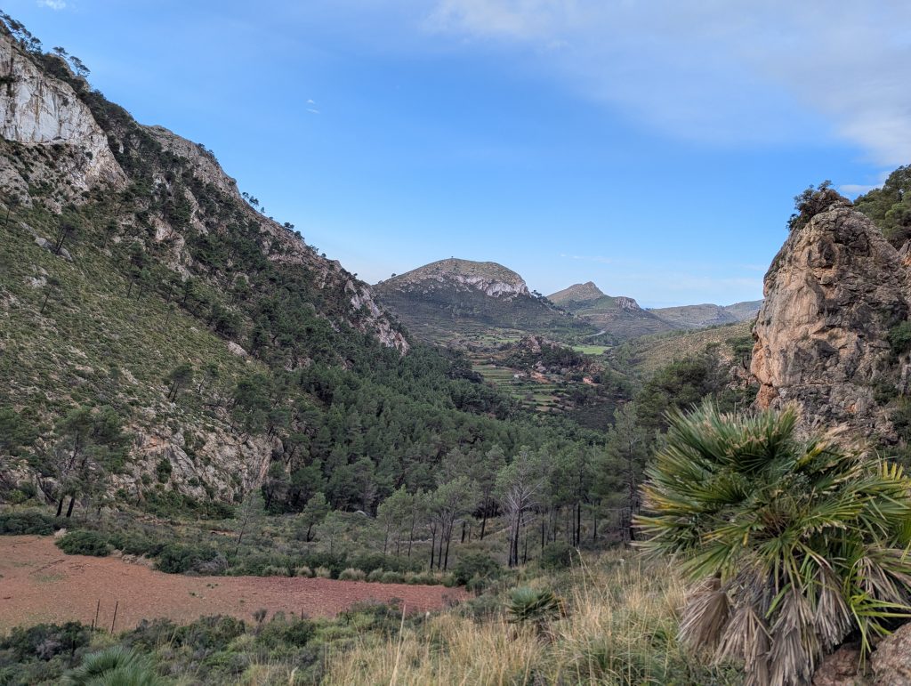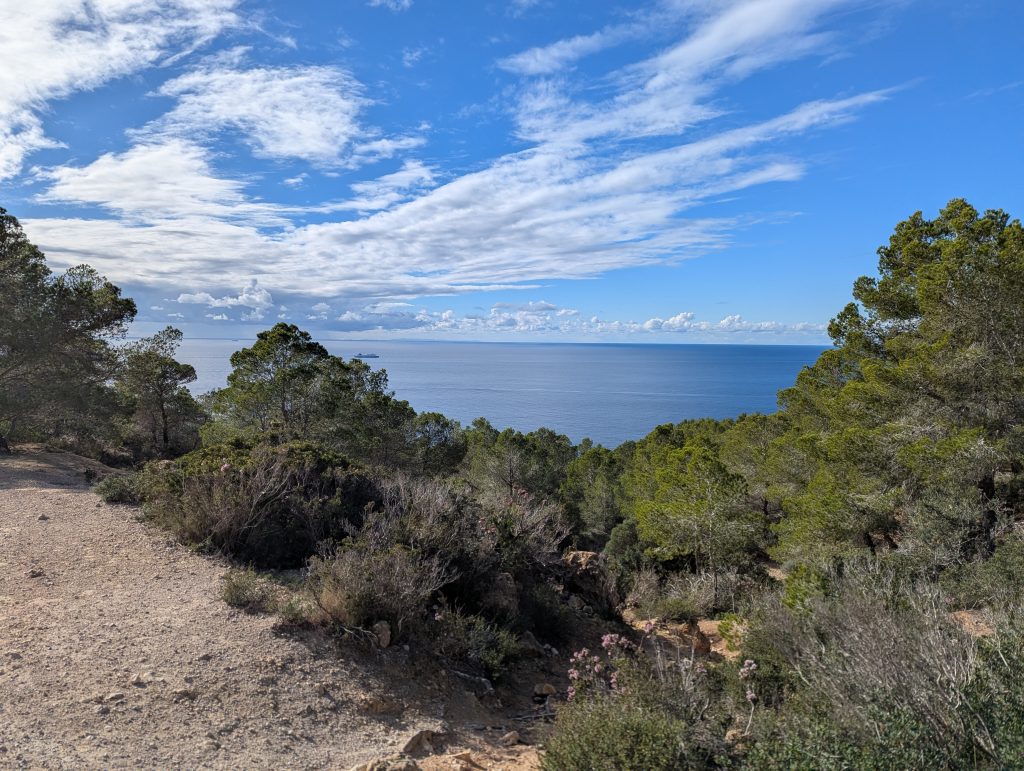 Bei schönstem Sonnenschein laufe ich auch direkt los. Bereits nach wenigen Minuten treffe ich auf Achat, einen anderen Wanderer der in Valencia lebt, in Kirgisistan geboren und in Russland aufgewachsen ist (wenn ich es richtig in Erinnerung habe). So wie ich, hat auch er vor im Zelt zu übernachten, aber im Gegensatz zu mir, muss er bereits am Sonntag Abend heim und somit hat er ein etwas stressigeres Programm als ich. Da wir das gleiche, schnelle Tempo haben (wir starten auch heute wieder mit 5km/h), laufen wir die nächsten Stunden zusammen. Es geht direkt leicht den Berg hinauf und schon bald bekommen wir einen ersten Blick auf das Meer.