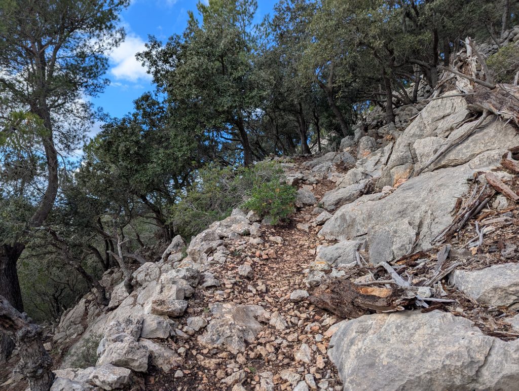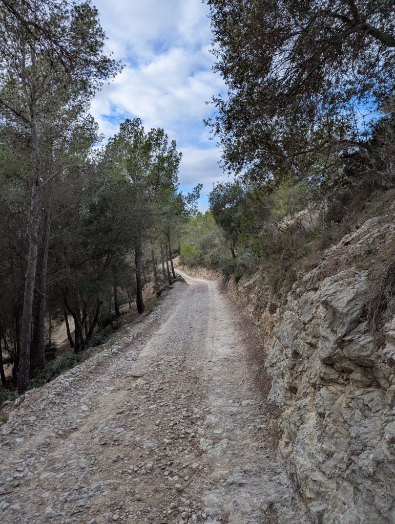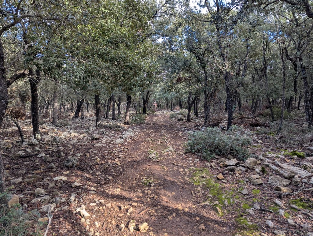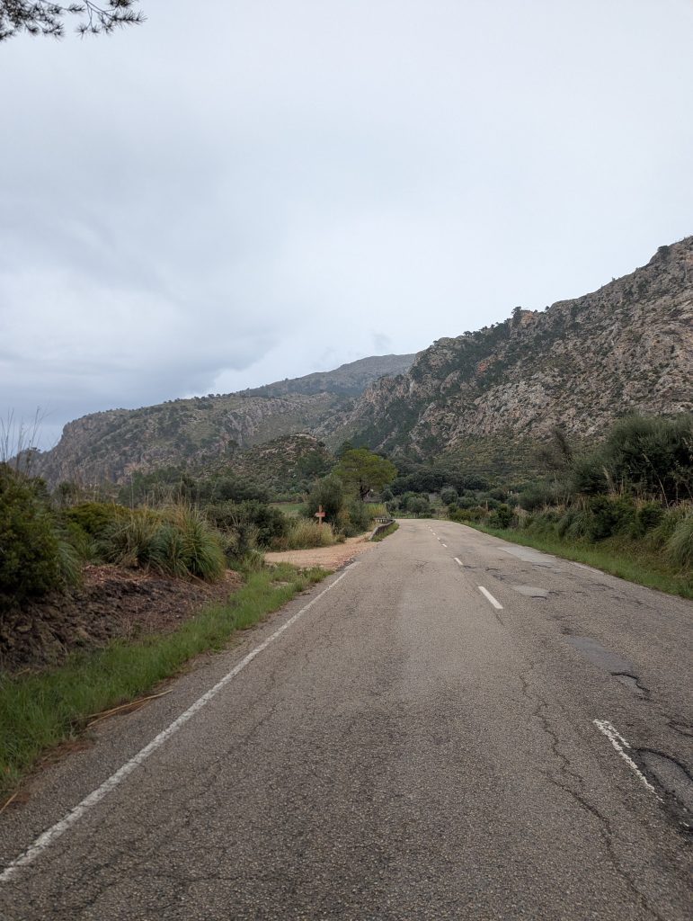Oben am Berg angekommen, folgt ein längerer Abstieg durch den Wald, bevor ich gegen halb 12 Esporlas erreiche. Da es mir für Mittagessen zu früh ist, kaufe ich in einem Supermarkt Wasser und etwas zu Essen für unterwegs. Dann mache ich mich wieder auf den Weg.