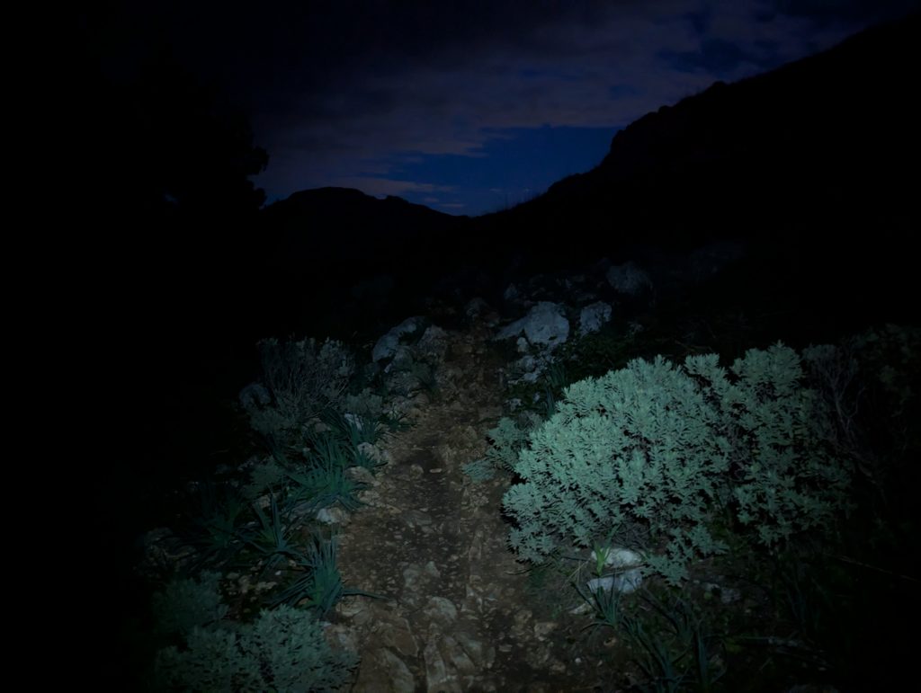 Bald komme ich am höchsten Punkt an. Auch wenn es hier einige schöne Zeltplätze gäbe, muss ich leider weiter. Es ziehen dunkle Wolken auf und wenn ich es richtig in Erinnerung habe, soll es heute Nacht gewittern. Dabei möchte ich natürlich nicht auf dem höchsten Punkt ohne Schutz ausgesetzt sein und somit geht es wieder an den sanften Abstieg. Schon bald ist es so dunkel, dass ich meine Stirnlampe auspacken muss, um den Weg gut sehen zu können. Fortan laufe ich durch die Dunkelheit.