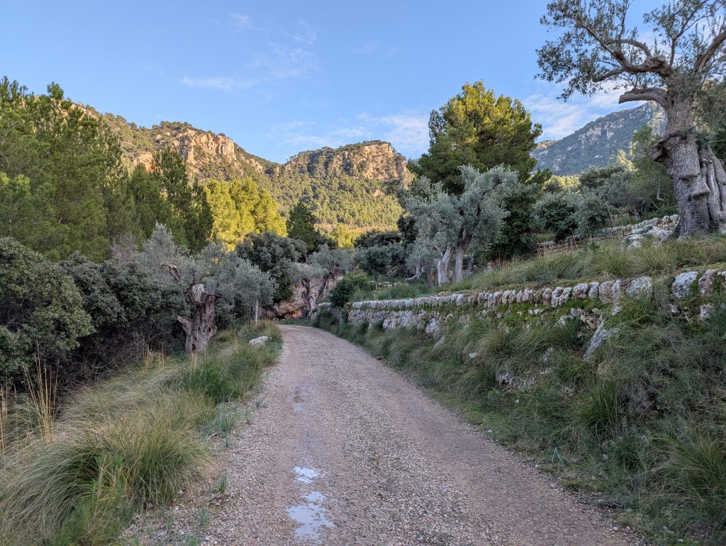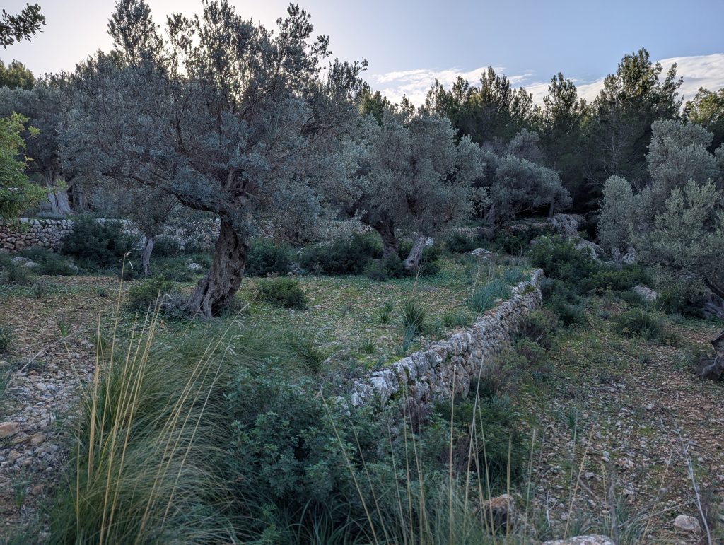 Irgendwann verlasse ich den Weg, um eine Abstecher über einen Fincaweg zu machen. Hier geht es schön durch angelegte Olivenplantagen und die Trockenmauern, die dem Wanderweg seinen Namen geben, sind gut zu sehen.