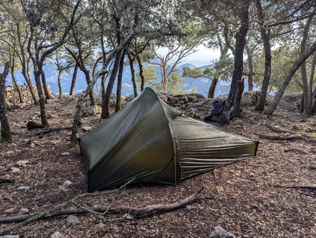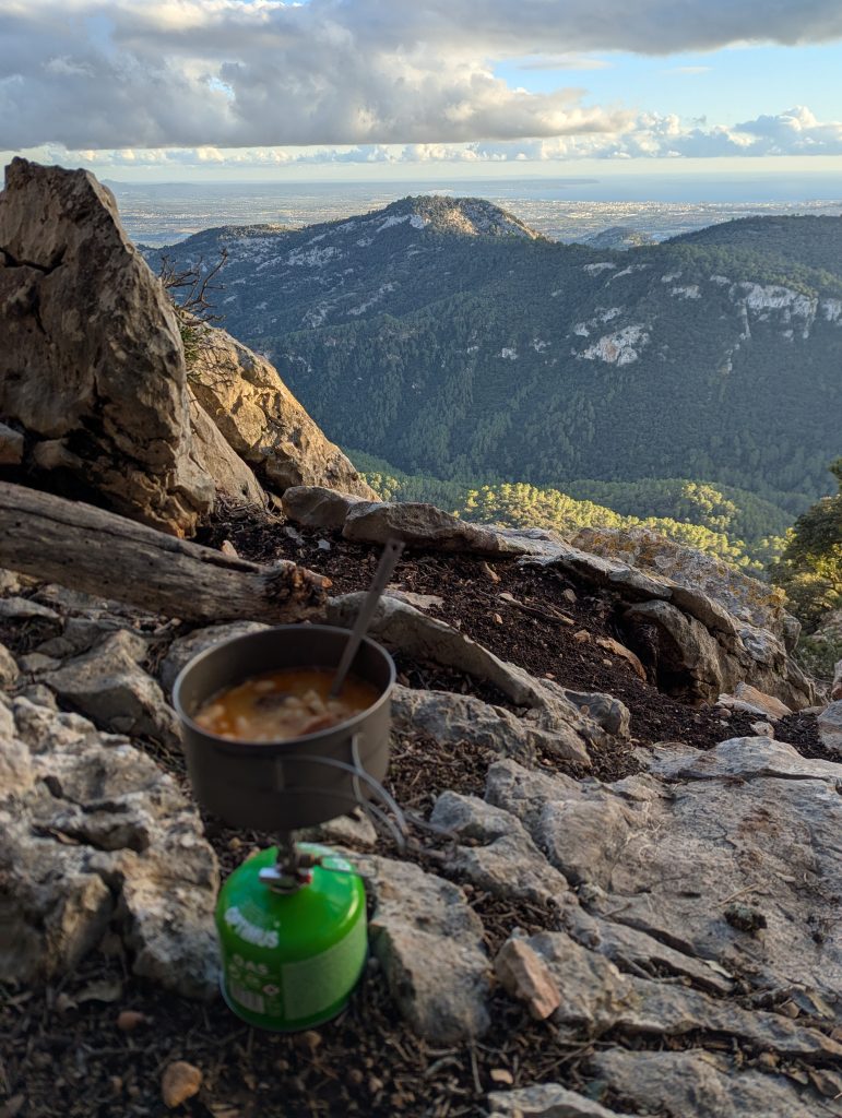 Nachdem ich weiter nach oben gelangt bin und mir seit der Mittagspausen kein einziger Mensch begegnet ist, entscheide ich mich hier mein Nachtlager aufzuschlagen. Ich baue mein Zelt an einem sonnigen Platz auf, damit dieses noch austrocknen kann. In der Zwischenzeit koche ich mir etwas zu Essen und schaue dabei der untergehenden Sonne zu.