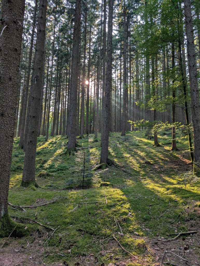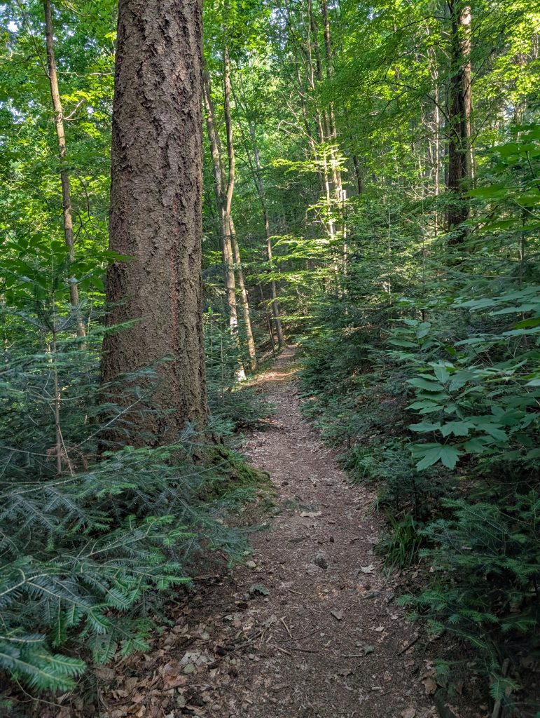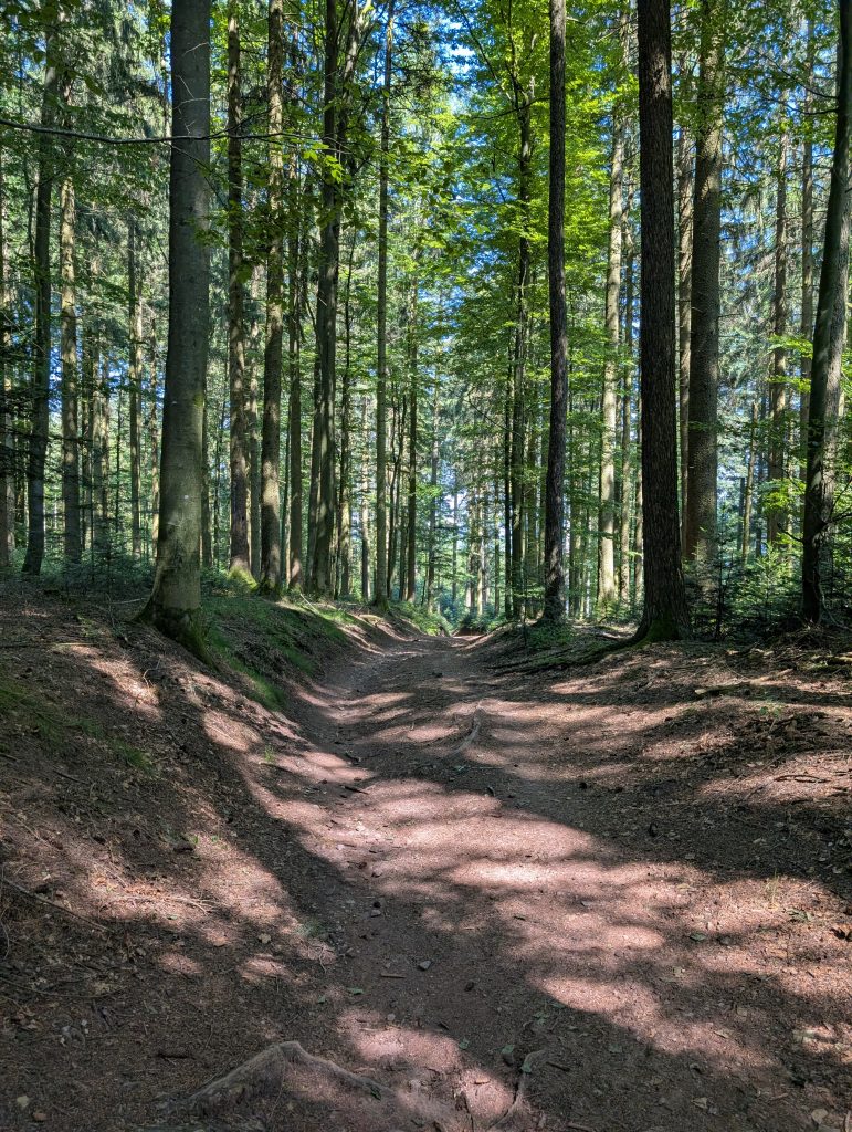 Nachdem ich wieder unten angelangt bin, mache ich mich erneut auf den Weg und darf direkt auf schmalen Wegen weiter durch den Wald wandern. Im kühlen Schatten ist das Gehen ganz angenehm und macht richtig Spaß. Fortan folge ich dem grünen Symbol des Zweitälersteigs durch den Wald.