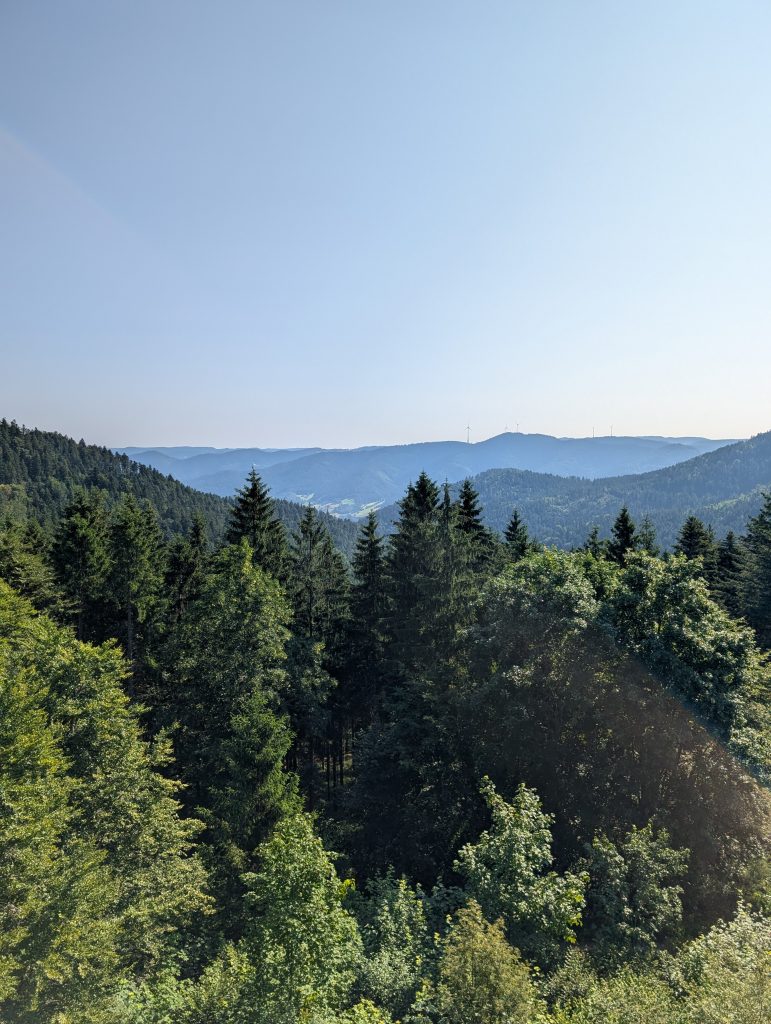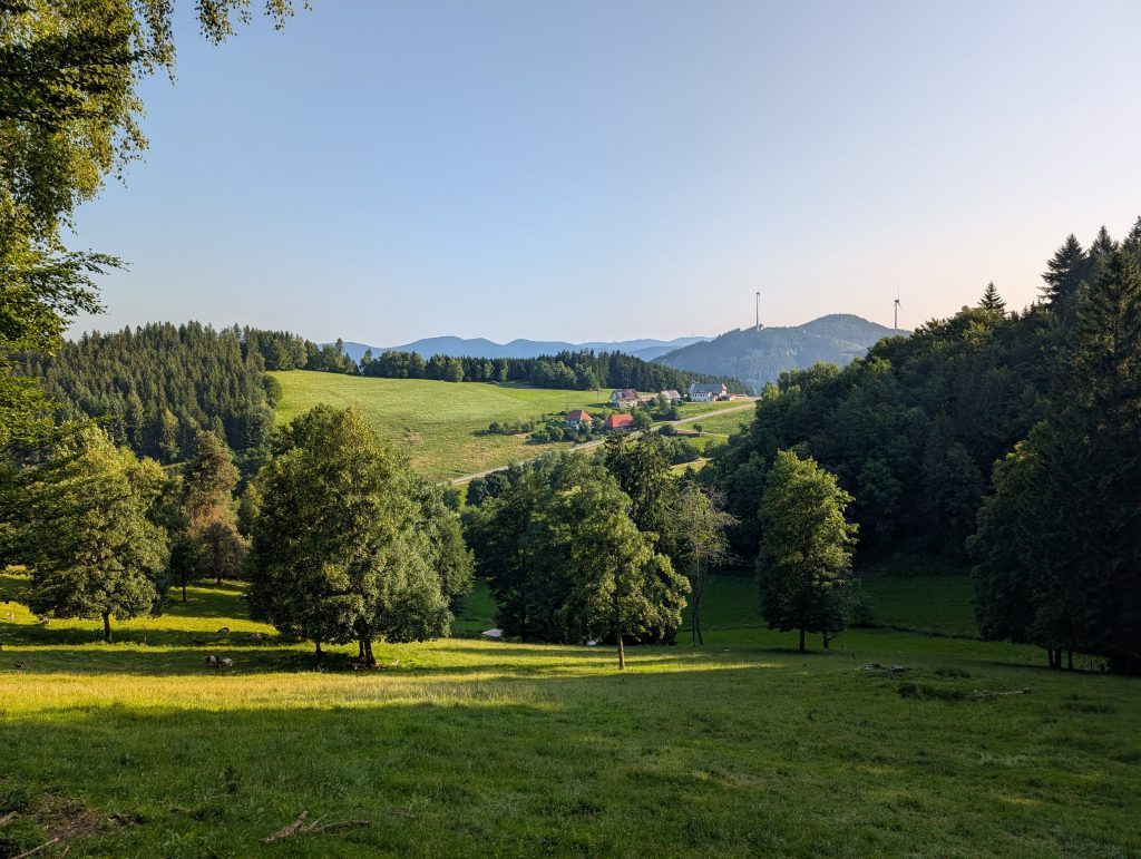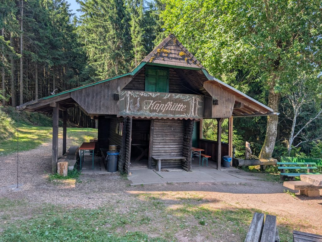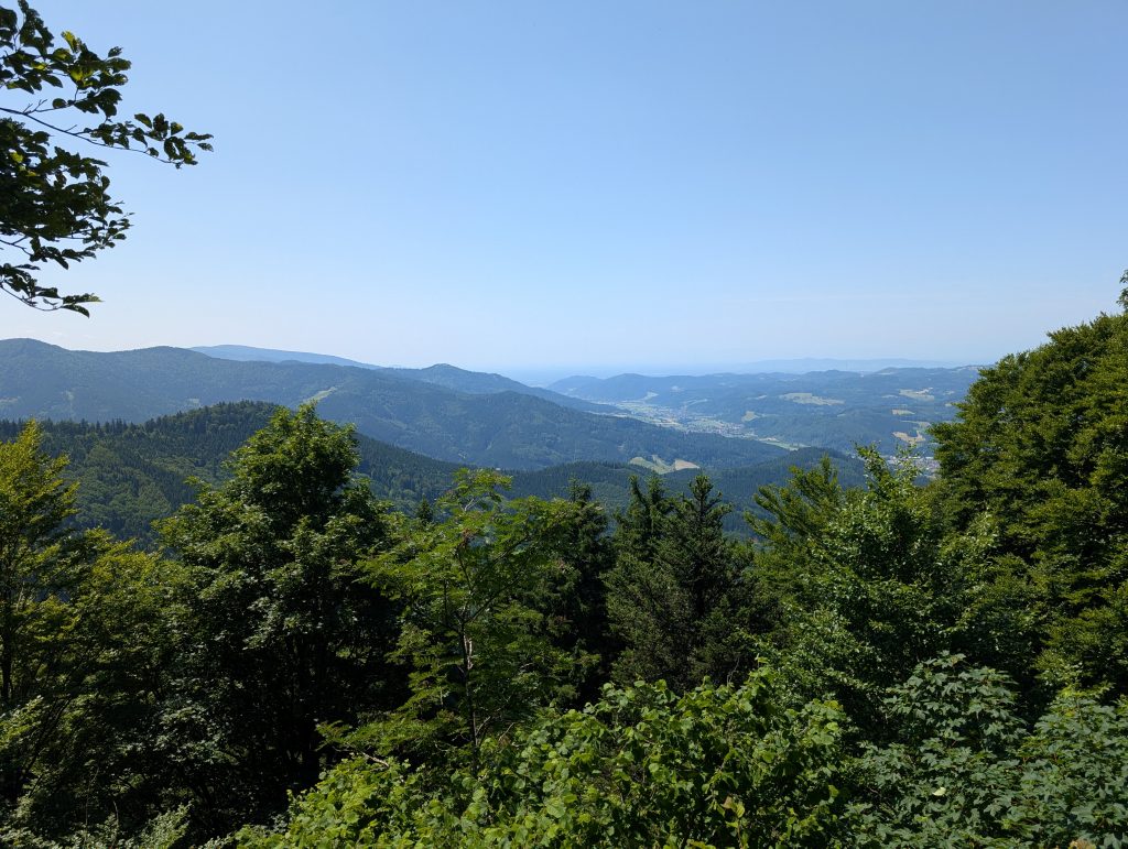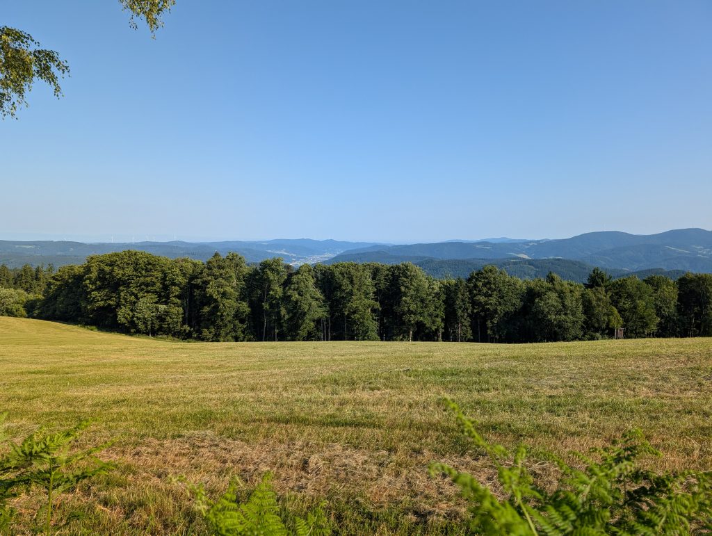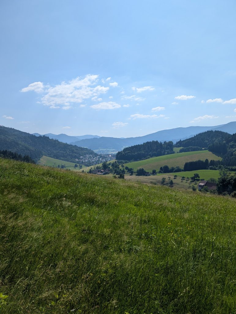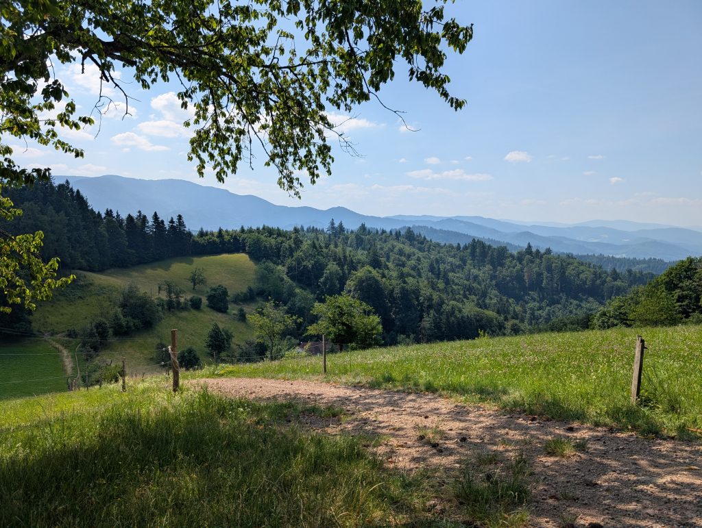 Danach mache ich mich wieder allein auf den Weg nach Wittenach. Den kleinen Ort habe ich schnell durchquert und auf der anderen Seite folgt ein langer, anstrengender Anstieg. Der Weg zieht sich immer weiter in die Länge und ich komme richtig ins Schnaufen. Der Schweiß läuft regelrecht an mir herab und ich sehne mich nach dem Ende des Anstiegs. Wie ich aber feststellen muss, geht es noch ein ganzes Stück weiter nach oben. Immerhin wird der Anstieg etwas flacher und somit kann ich einigermaßen normal den Berg hinaufsteigen. Ganz oben thront die Kapfhütte, welcher ein regelrechtes Schwarzwald Panorama zu Füßen liegt. In der Ferne kann ich die Hornisgrinde, den höchsten Berg des Nordschwarzwalds ausmachen. Da mir die Aussicht so gut gefällt, ich vom Anstieg ziemlich erschöpft bin und es gerade Mittagszeit ist, lege ich hier meine Mittagspause ein.