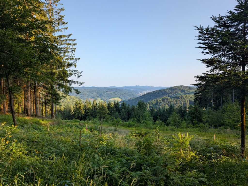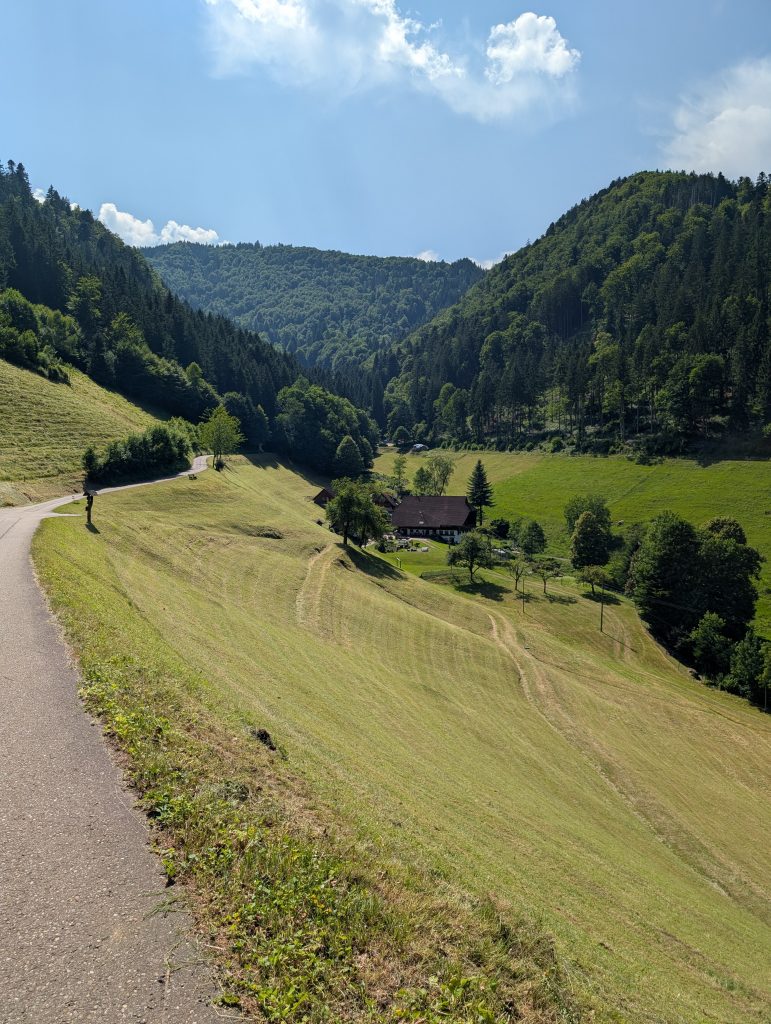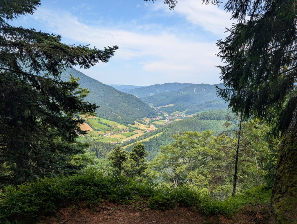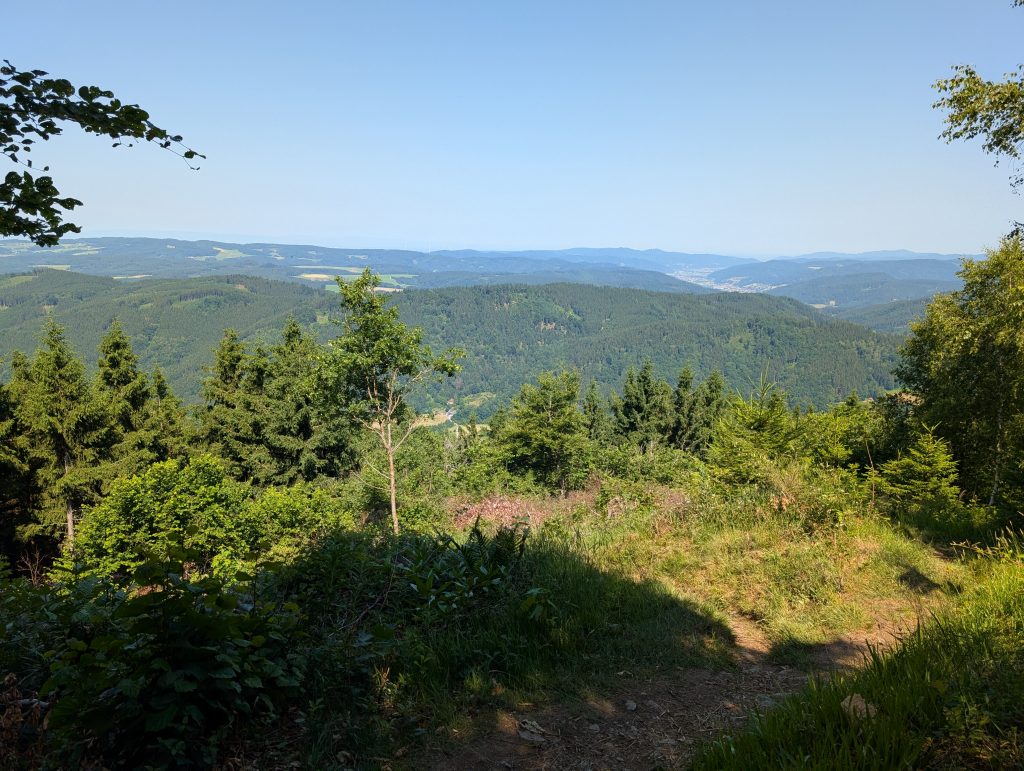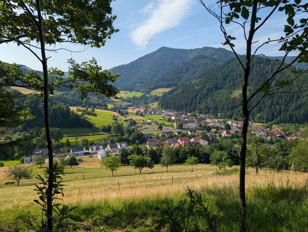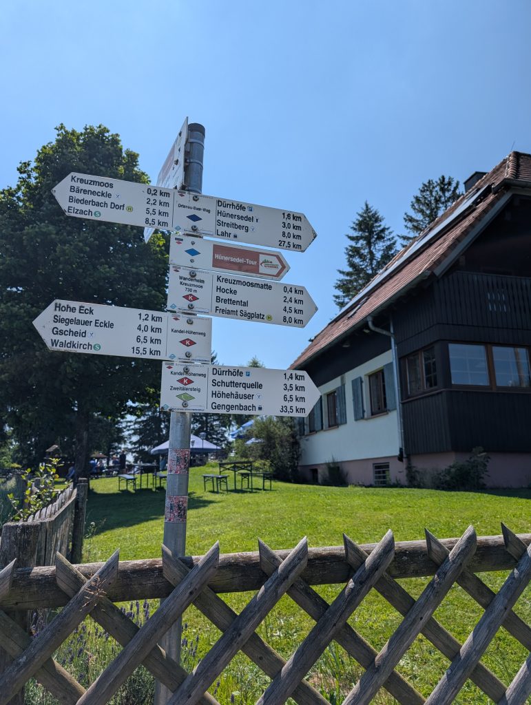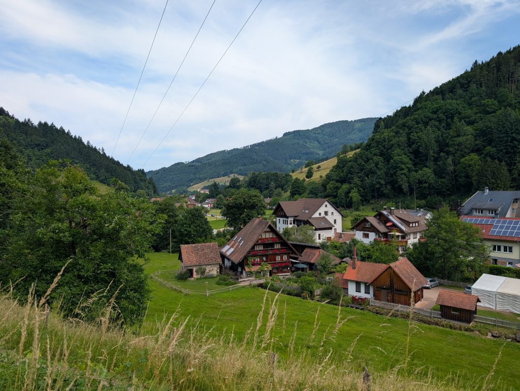 Danach mache ich mich wieder allein auf den Weg nach Wittenach. Den kleinen Ort habe ich schnell durchquert und auf der anderen Seite folgt ein langer, anstrengender Anstieg. Der Weg zieht sich immer weiter in die Länge und ich komme richtig ins Schnaufen. Der Schweiß läuft regelrecht an mir herab und ich sehne mich nach dem Ende des Anstiegs. Wie ich aber feststellen muss, geht es noch ein ganzes Stück weiter nach oben. Immerhin wird der Anstieg etwas flacher und somit kann ich einigermaßen normal den Berg hinaufsteigen. Ganz oben thront die Kapfhütte, welcher ein regelrechtes Schwarzwald Panorama zu Füßen liegt. In der Ferne kann ich die Hornisgrinde, den höchsten Berg des Nordschwarzwalds ausmachen. Da mir die Aussicht so gut gefällt, ich vom Anstieg ziemlich erschöpft bin und es gerade Mittagszeit ist, lege ich hier meine Mittagspause ein.
