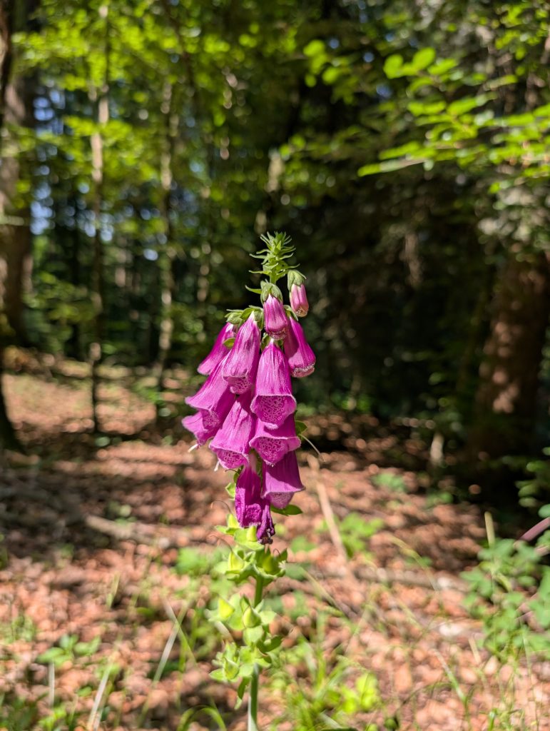 Immer häufiger führt mich der Weg über waldfreie Passagen, bei denen ich die Landschaft genießen kann oder an schön blühenden Blumen vorbei. Bei strahlendem Sonnenschein wirkt alles sehr beeindruckend, jedoch bringt mich die Hitze bei den Anstiegen auch gut ins Schwitzen.