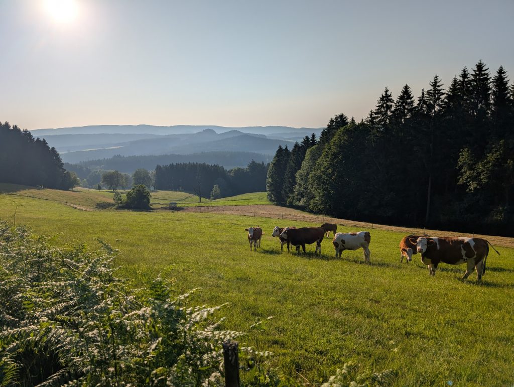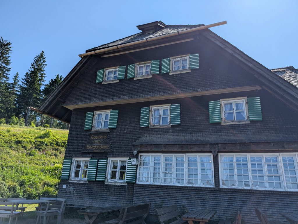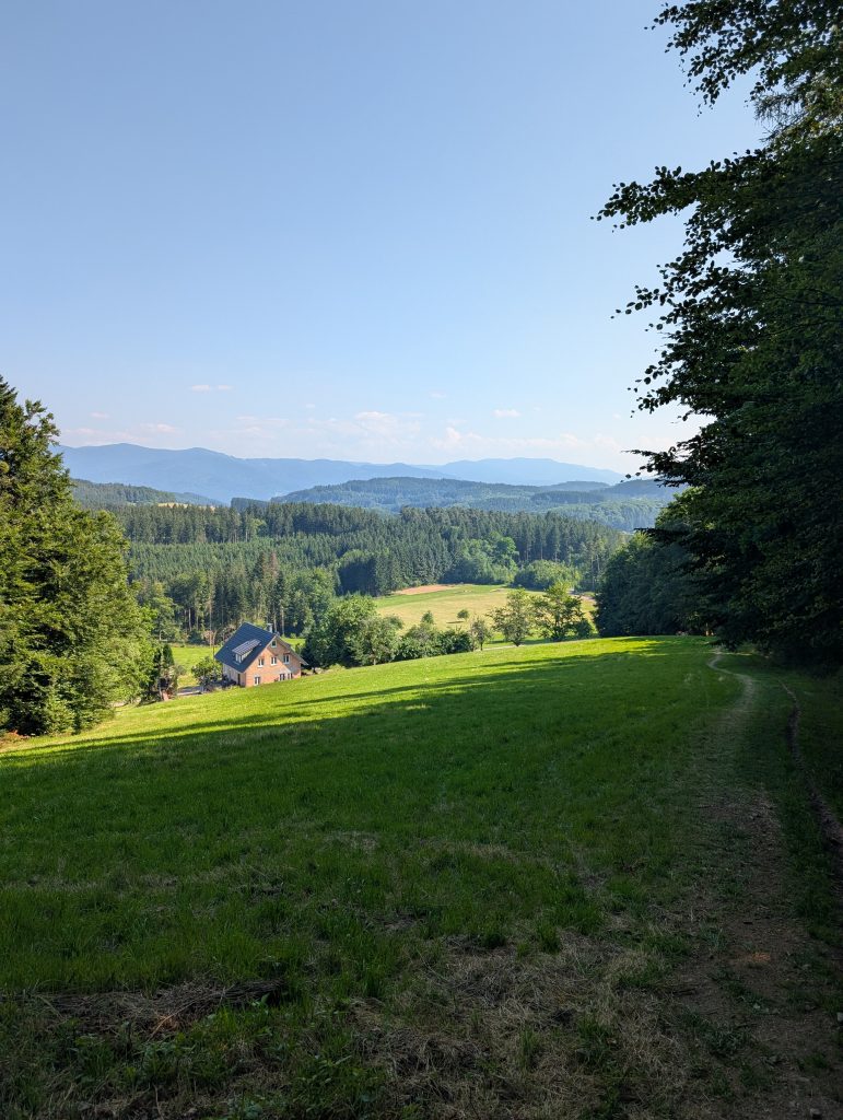 Bald darauf verlassen ich den Wald und treffe auf eine wunderschöne Lichtung, wo sich ein paar wenige Häuser tummeln. Ich laufe durch die schöne Landschaft weiter hinten den Berg hinauf und komme dort bei dem Gasthaus zur Schwedenschanze vorbei. Leider ist das Lokal geschlossen, aber immerhin gibt es neben dem Haus einen Kühlschrank, in dem man sich selbst bedienen kann. Als ich mir gerade ein Kaltgetränk gönne, kommen zwei Leute vorbei mit denen ich mich eine Weile unterhalte. Der Mann lebe hier und ist ein großer Fan des ZweiTälerSteig, auch wenn er heute mit seiner Bekannten nur eine kleine Runde wandert. Nachdem die beiden nach einem längeren Gespräch wieder aufgebrochen sind, lege ich mich auf eine Holzbank und lasse den Blick in die Ferne schweifen.