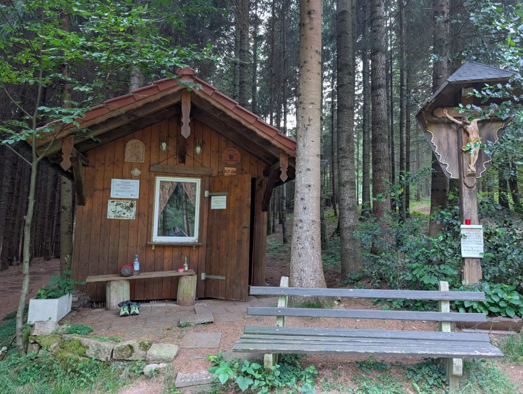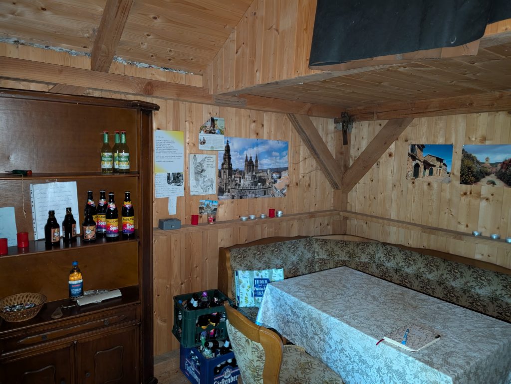 Leider führt mich der Weg später wieder häufiger durch den Wald und es gibt nicht mehr so viele Plätze mit guter Aussicht. Somit laufe ich einfach immer weiter, bevor ich nach etwas mehr als 38 km an „Opa Klausis Vesperstüble“ vorbeikomme. Zu meinem Glück stellt der nette Mann seine Hütte direkt am Wegesrand für Wanderer und Pilger zur Verfügung. Drinnen erkenne ich einige Bilder, die ich schon fast wehmütig betrachte.