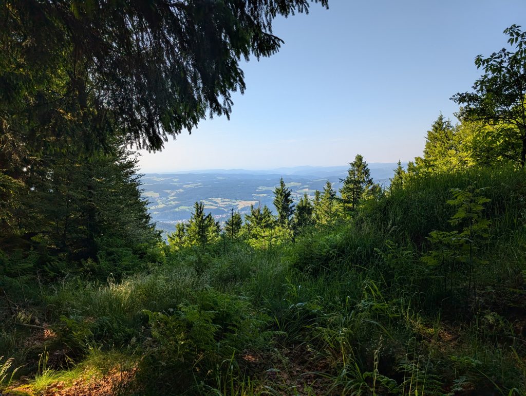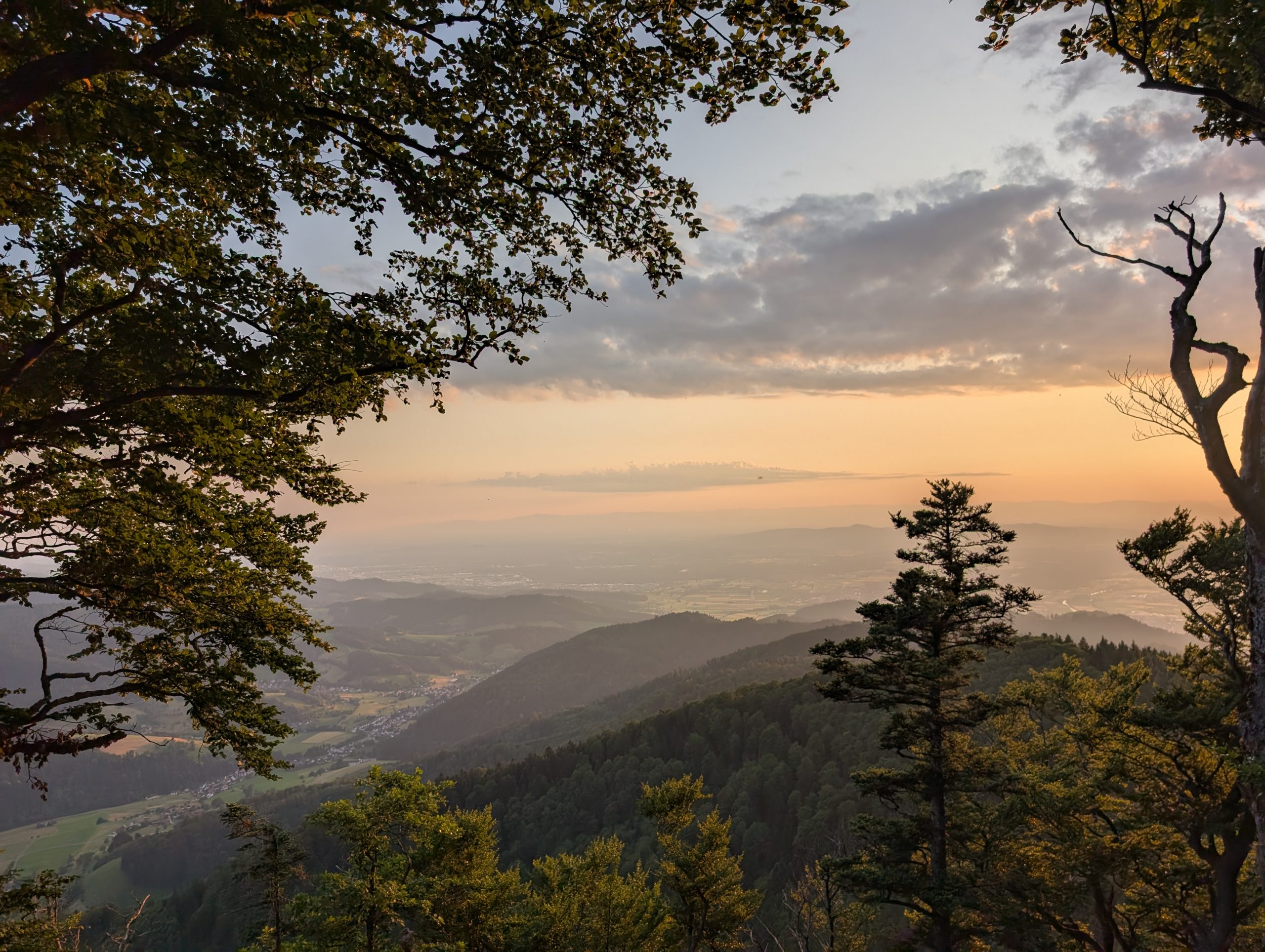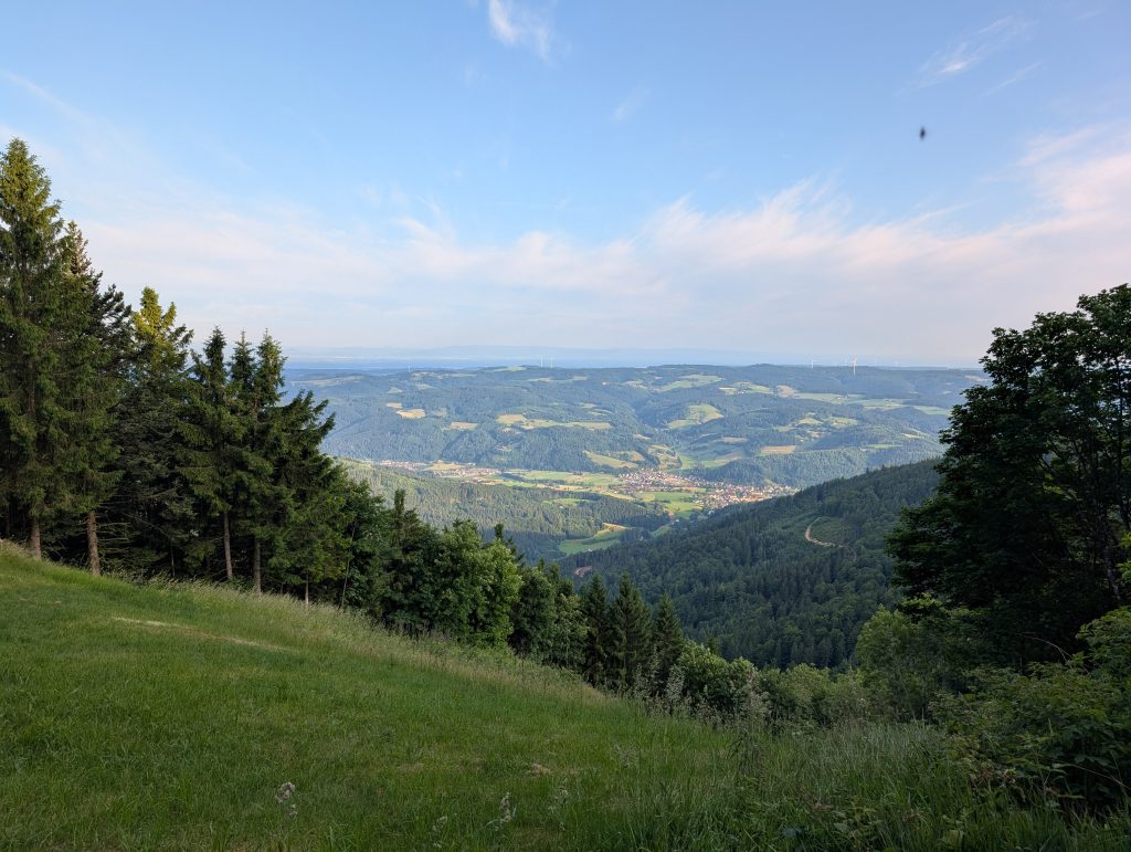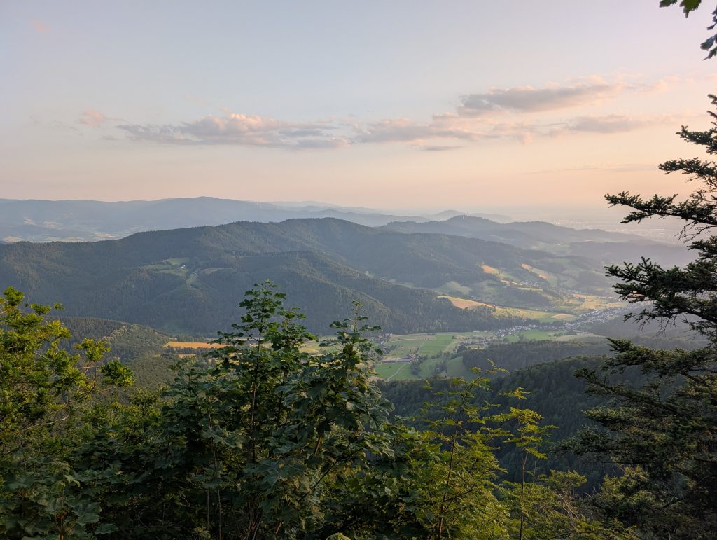 Gegen 20 Uhr erreiche ich dann endlich den Kandel (1241m), von wo aus ich einen super Blick auf die Umgebung habe. Leider ist hier ziemlich viel los, da heute anscheinend Sonnenwendfeier ist, was mich dazu bringt auf der anderen Seite schnell wieder einige Höhenmeter abzusteigen.