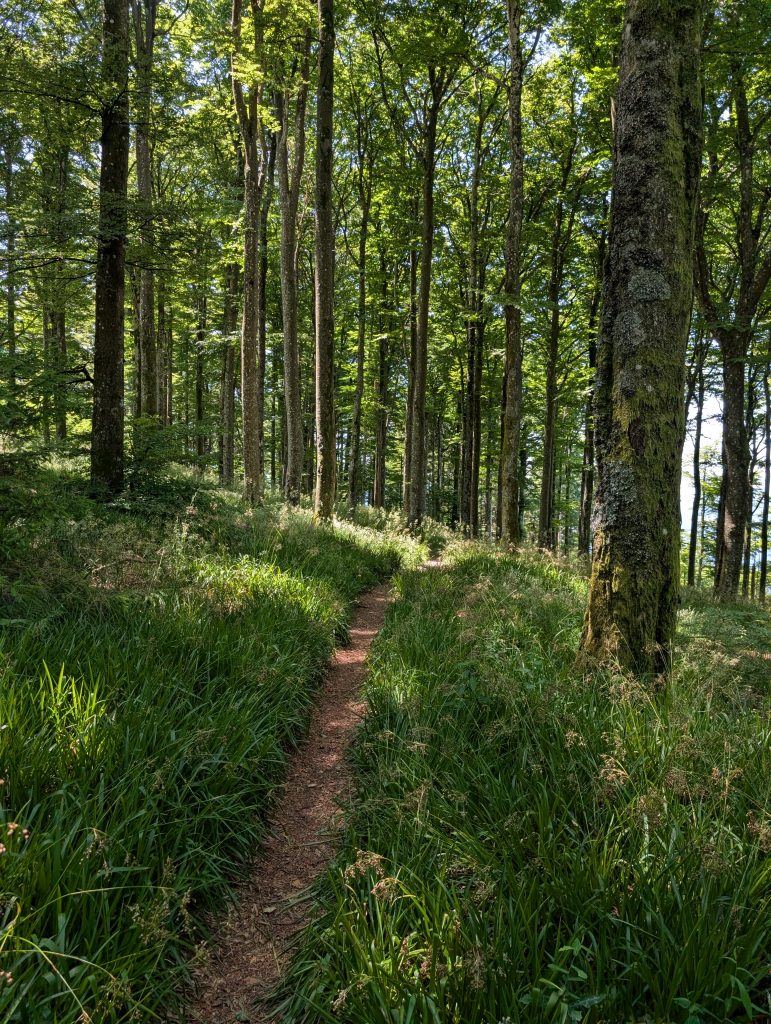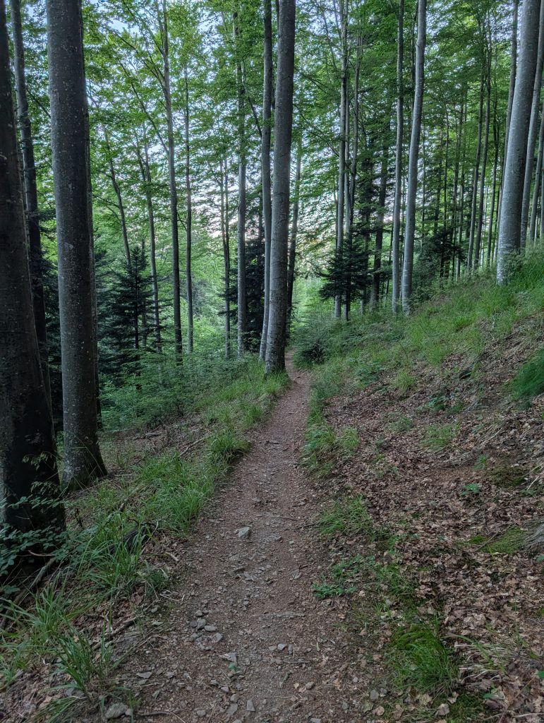 Kurz nach 12 Uhr mache ich mich dann auf den ersten langen Anstieg des Tages. Es geht einige hundert Höhenmeter hinauf und ich schnaufe ziemlich stark, sehe es aber nicht ein mein Tempo zu verlangsamen. Immerhin geht es durch den Wald nach oben, was das Laufen in den hohen Temperaturen (mittlerweile 28 Grad) noch einigermaßen angenehm macht.