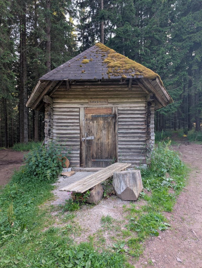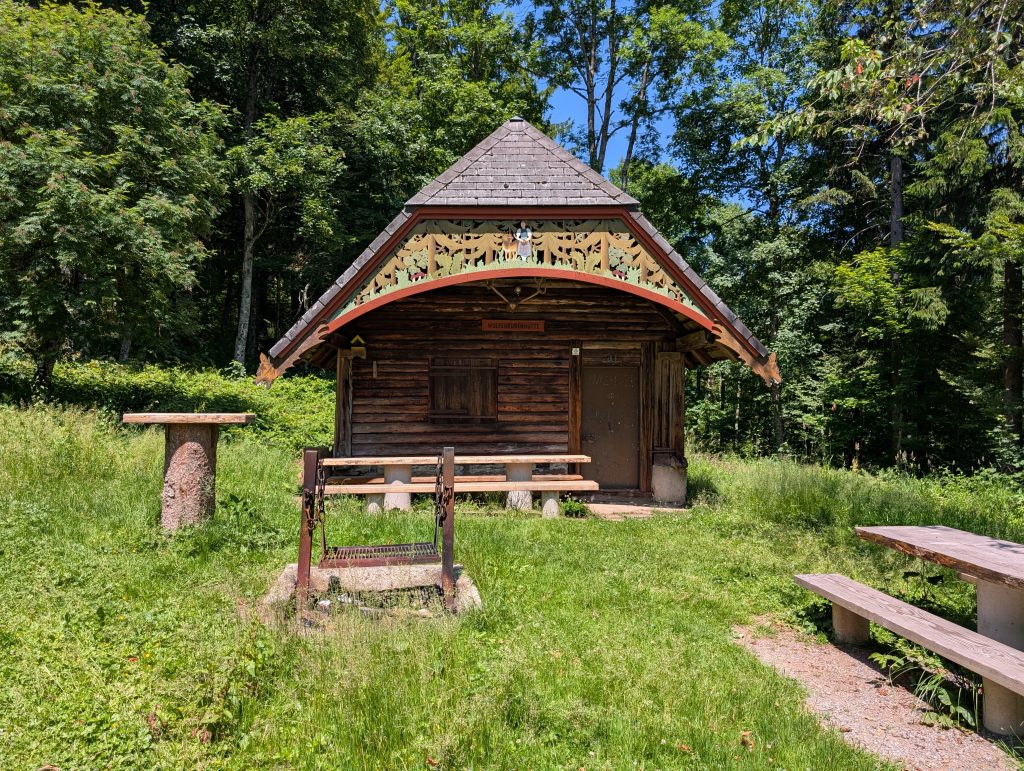 Es geht weiter entspannt über schmale Pfade durch den Wald und ich bin froh, dass ich im kühlen Schatten laufen kann. Unterwegs komme ich an der Wolfsgrubenhütte vorbei, die regelrecht wie ein Hexenhaus wirkt. Leider ist die Hütte verschlossen und somit ziehe ich weiter.
