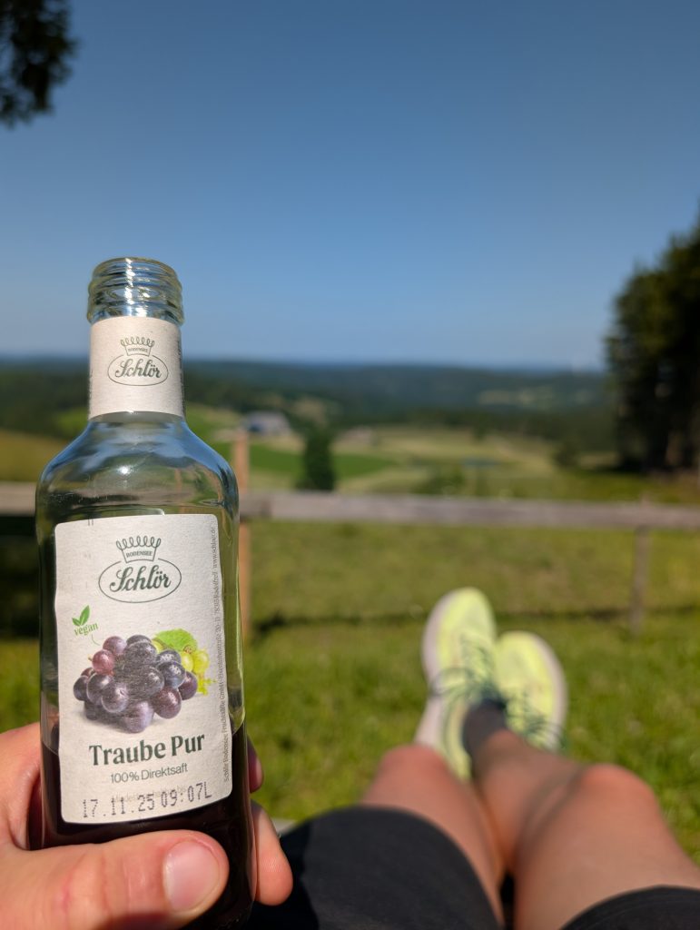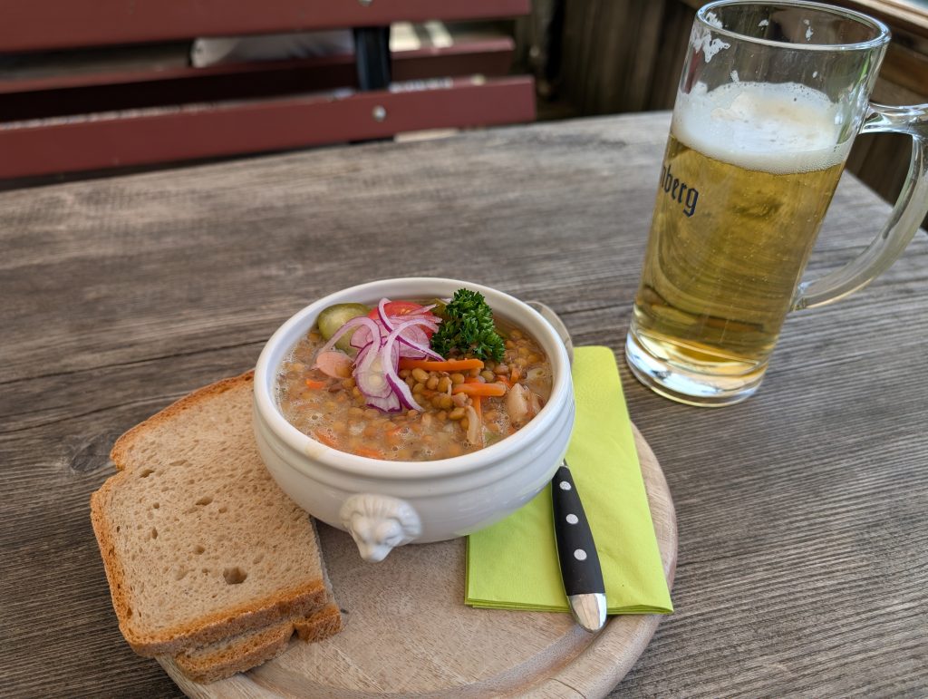 Nach einer gefühlten Ewigkeit komme ich komplett durchgeschwitzt und ziemlich erschöpft an der Hütte Hintereck an. Hier lege ich eine verspätete Mittagspause ein. Ich genieße einen leckeren Linseneintopf und trinke dazu ein kühles Radler.