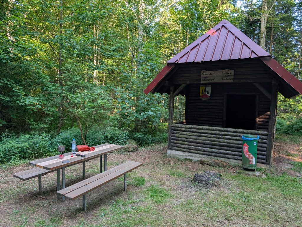 Im vorhandenen Gästebuch, stehen bereits viele Leute drin, die hier eine Pause oder die Nacht verbracht habe. Somit beschließe ich, dass auch ich hier übernachten werde. Glücklicherweise gibt es gegen eine Spende sogar noch Radler und schon bald sitze ich vor der kleinen Hütte auf einer Bank, genieße mein Radler und esse noch kurz zu Abend. Aufgrund meines späten Starts, ist es auch schon nach 9 Uhr als ich damit fertig bin. Ich schreibe noch kurz Tagebuch und lese noch ein bisschen, während neben mir die vielen Vögel im Wald noch ihr Gute-Nacht-Lied vorsingen. Danach gehe ich nach einer schönen Wanderung erschöpft schlafen.
