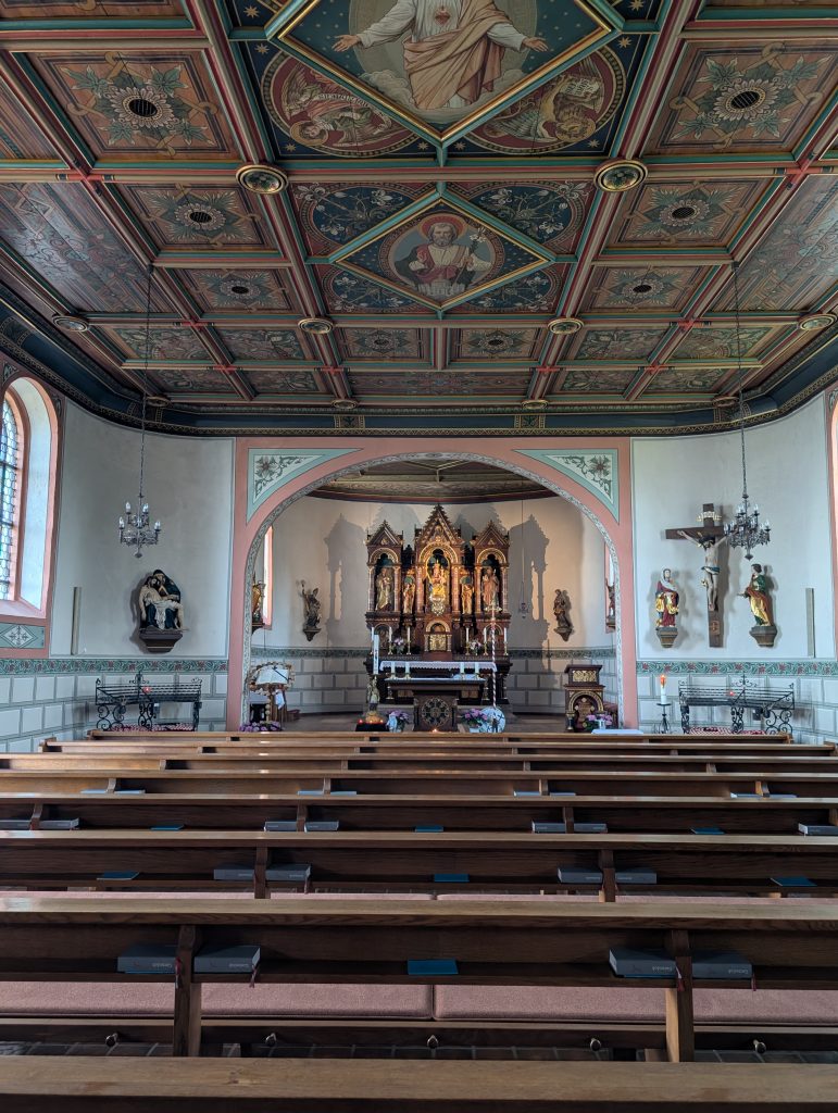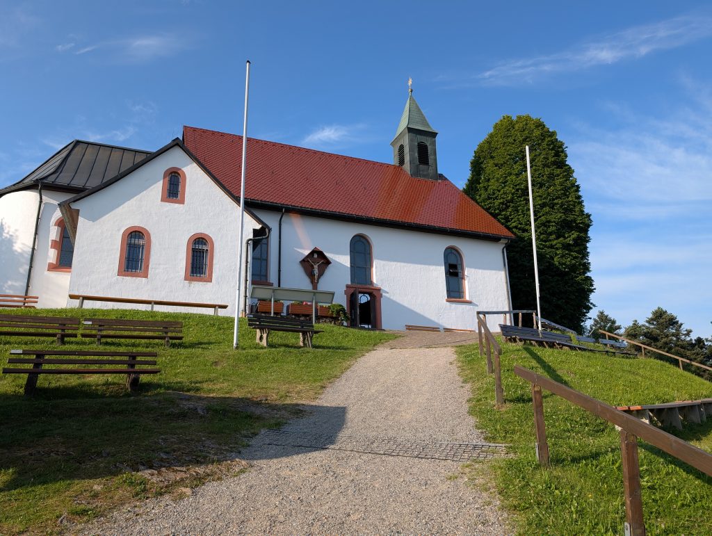 Bereits nach kurzer Zeit komme ich zur Wallfahrtskapelle auf dem Hörnleberg, welche das ersten Highlight des Tages für mich ist. Die Kapelle sieht nicht nur von innen schön aus, sondern kann auch von außen überzeugen. Besonders der weit schweifende Blick auf die Umgebung ist ein echter Genuss. Da nachher ein Gottesdienst stattfindet, sind einige Leute aus den Tälern aufgestiegen und es kommen immer mehr dazu. Anscheinend falle ich mit meinem Rucksack aber trotzdem schnell auf, denn ich werde direkt vom Pfarrer und anderen Leuten angesprochen, die sehr an meiner Tour interessiert sind. Nach längeren Gesprächen und einer Tasse Kaffe bei schöner Aussicht später, mache ich mich langsam wieder auf den Weg nach Simonswald.