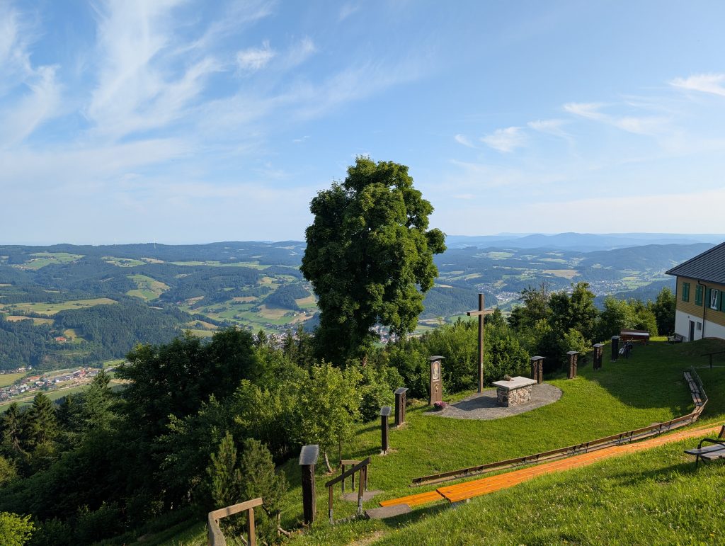 Nach längerer Zeit erreiche ich das Wanderheim Kreuzmoos, wo ich eine verspätete Mittagspausen einlege. Der Ort ist gut besucht, aber das Essen kommt trotzdem schnell. Ich gönne mir eine Wurst mit Brot und dazu ein kühles Radler, welche ich im Schatten zu mir nehme. Danach geht es in der warmen Mittagssonne weiter auf und ab.