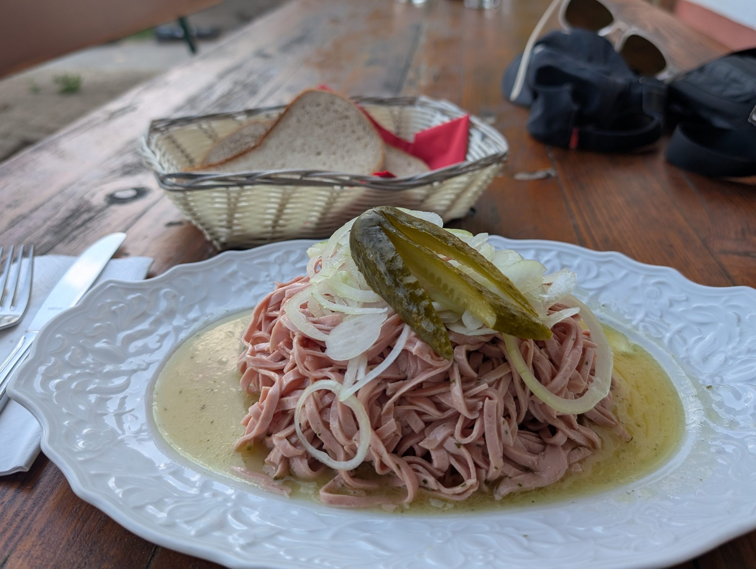 Nachdem ich auch hier längere Zeit aufgestiegen bin, erreiche ich ein kleines Plateau. Mittlerweile lässt die Kraft der Sonne bereits etwas nach und somit ist das Laufen außerhalb des Waldes trotzdem sehr angenehm. In einem Restaurant auf dem Weg esse ich gegen 18 Uhr nochmals einen Wurstsalat, um mich nach dem anstrengenden Anstieg zu erholen und neue Kraft zu tanken.