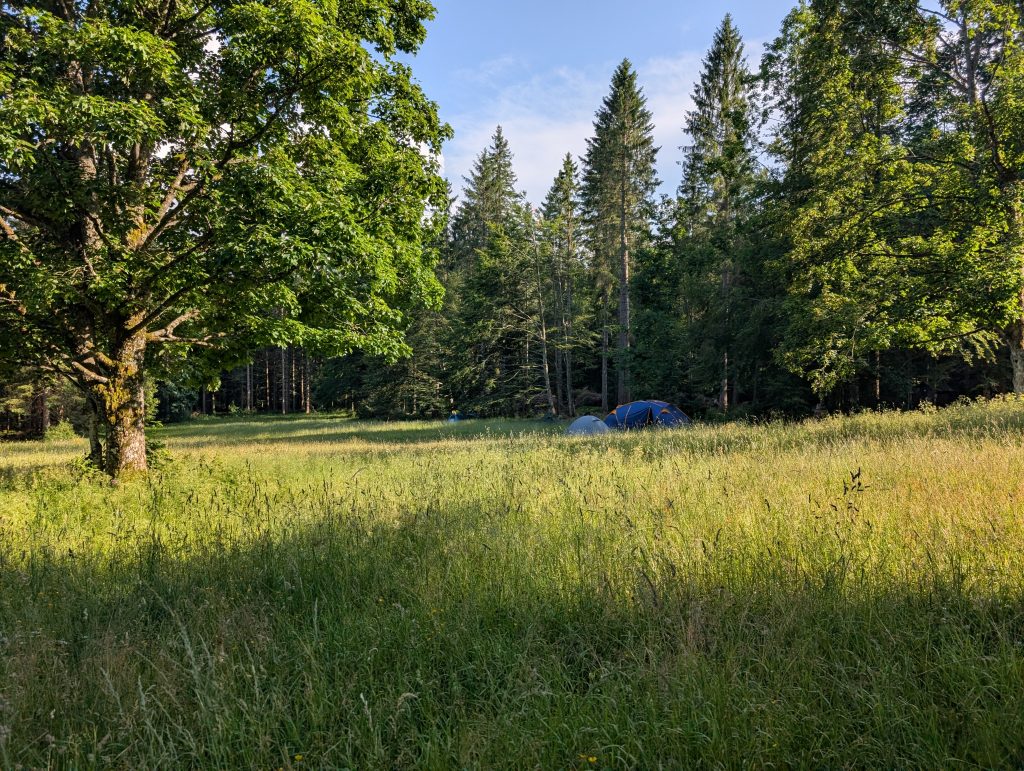 Über den Hörnlepfad laufe ich weiter bis zur Dorerbühl-Hütte, einer kleinen Schutzhütte mitten im Wald. Auch wenn es hier kein Wasser gibt, so entscheide ich mich doch hier zu bleiben. Mit meinem letzten Liter Wasser koche ich mir mein Abendessen und lese danach auf der schönen Holzveranda, bis die Sonne anfängt unter zu gehen und ich mich in meinem Schlafsack auf den Boden lege und schnell einschlafe.