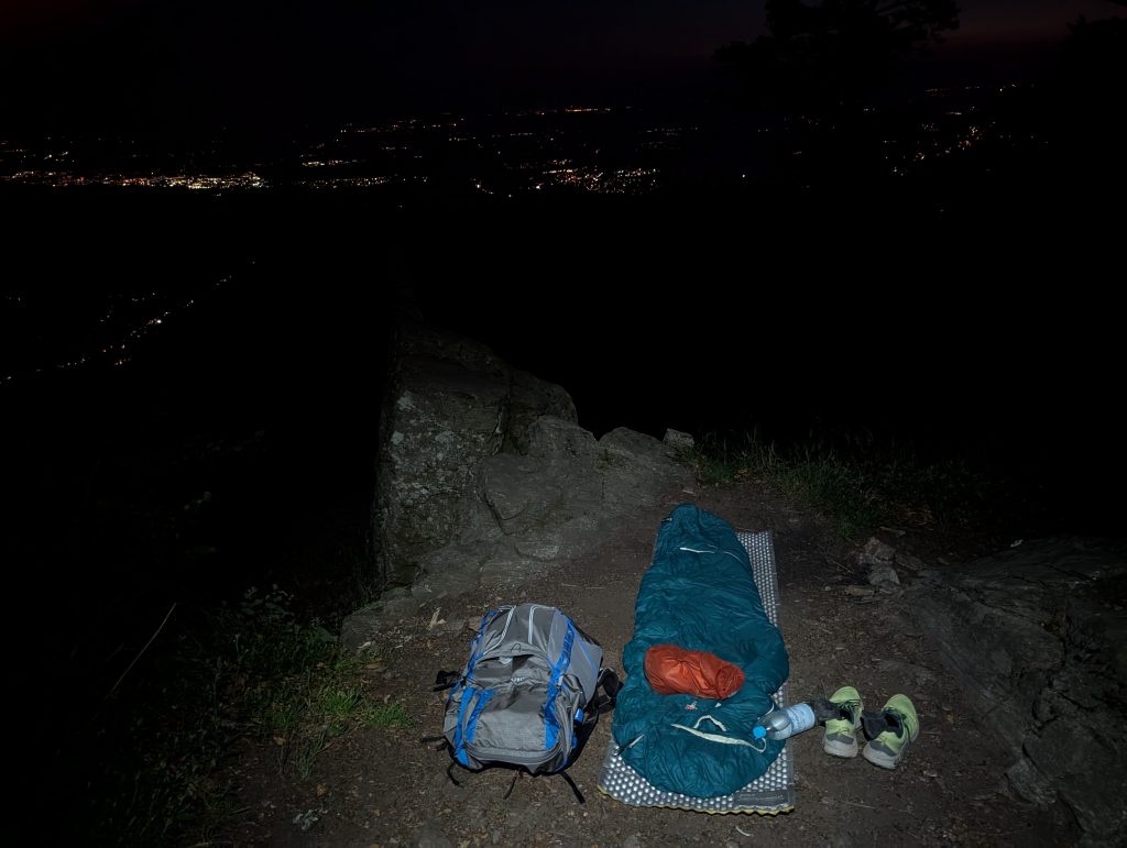 Nach einem unterhaltsamen Abend gehe wir gegen 23 Uhr dann beide wieder schlafen. Da ich keine Lust habe in der Hütte zu liegen, lege ich mich auf einen Felsvorsprung, welcher überraschend windgeschützt ist und von wo aus ich einen schönen Blick ins Tal und auf die Sterne habe. Bald schlafe ich nach einem langen Tag, immerhin habe ich mehr als 38 km und über 1700 Höhenmeter zurückgelegt, erschöpft ein.