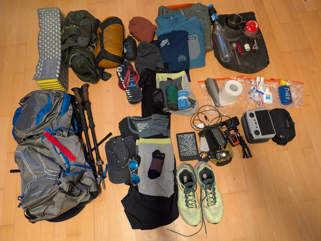 Hier ein kleiner Überblick meiner Ausrüstung. Mein Basisgewicht liegt für diese Tour bei etwa 8,5kg. Zusätzlich habe ich noch Essen für zwei Tage eingepackt und ich gehe davon aus, das ich im Schnitt 1-2 Liter Wasser mittragen werde. Somit komme ich auf ein Gesamtgewicht von etwas mehr als 10 kg, was durchaus machbar sein sollte.