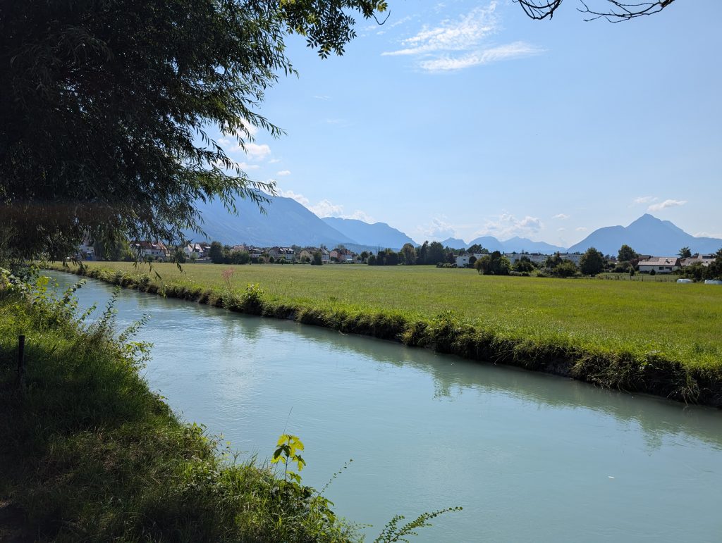 Es geht weiter flach voran, aber langsam sehe ich im Hintergrund die Berge, auf die ich heute noch aufsteigen darf.