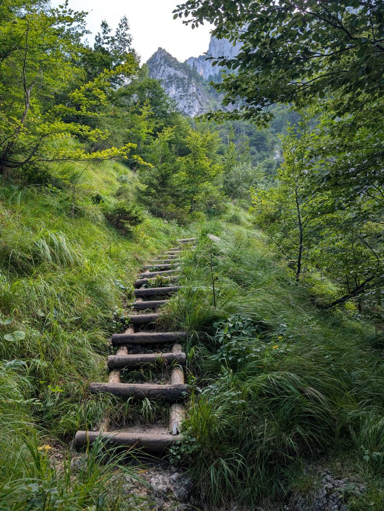 Während die ersten Kilometer noch sehr flach sind, zieht der weg ab Glanegg deutlich an. Bis zum Zeppezauerhaus, wo ich heute übernachten möchte, habe ich mehr als 1000 Höhenmeter zu überwinden. Es geht von nun an permanent nach oben. Immer wieder führen mich Treppen aus Holz oder in den Fels geschlagene Stufen weiter in die Höhe, was mit der Zeit ziemlich anstrengend wird.