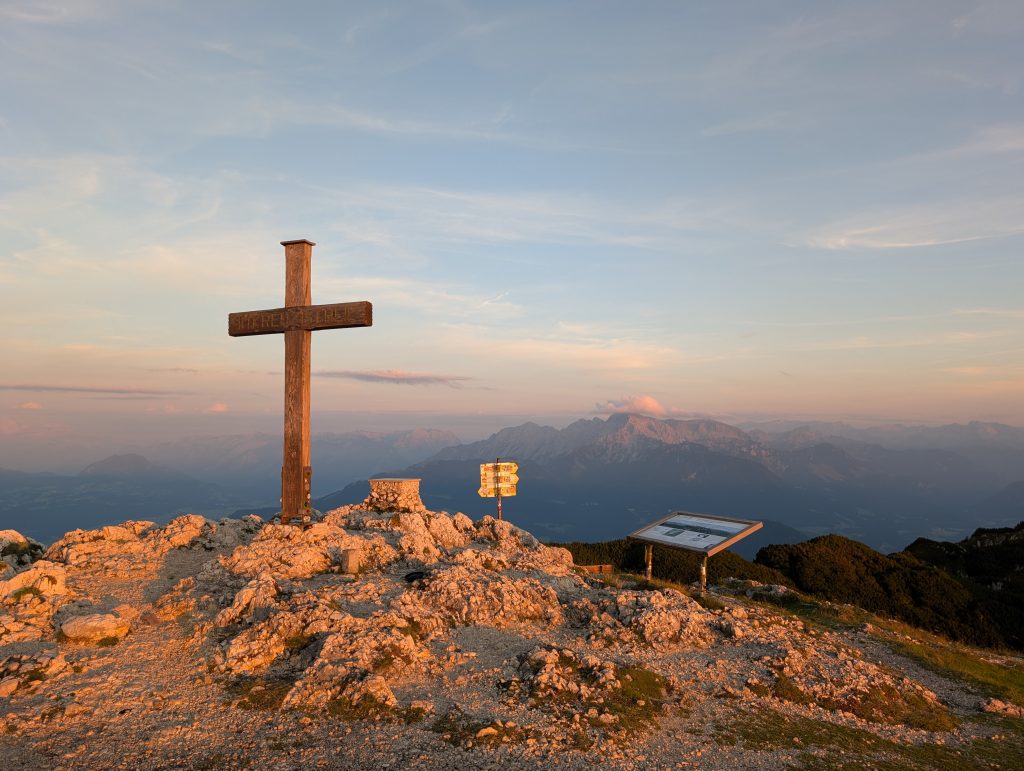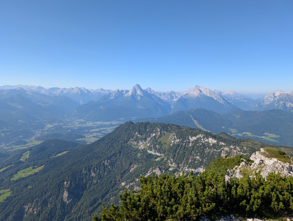 Auf einem Hochplateau geht es für mich weiter bis zum Berchtesgadener Hochthrohn, von wo aus ich einen atemberaubenden Rundumblick habe. Vor mir ist der Watzmann klar zu erkennen und auch sonst erblicke ich einige markante Berge in der Umgebung. Auf dem Gipfel setzte ich mich für einige Minuten hin und genieße die Aussicht ringsherum.