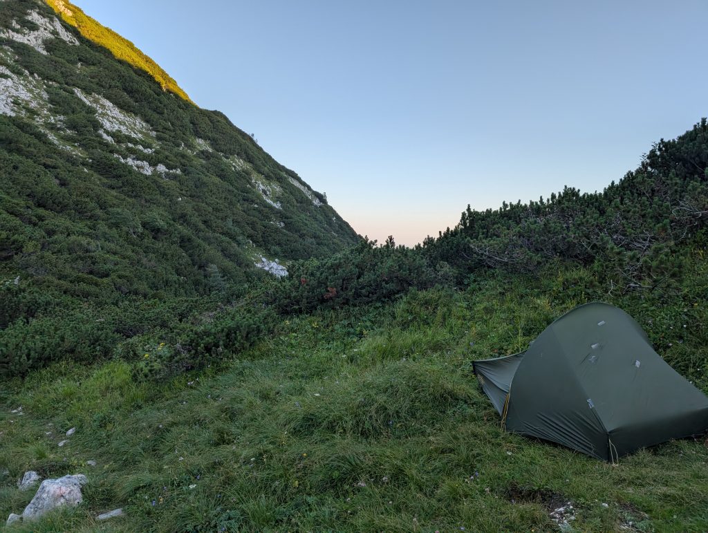 Hier finden ich kurz vor 21 Uhr endlich einen flachen Platz, auf den mein Zelt passen sollte und welcher nicht direkt vom Weg einsehbar ist. Ich baue schnell mein Zelt auf, koche mir im Licht meiner Stirnlampe noch mein verdientes Abendessen und gehe danach komplett erschöpft schlafen.