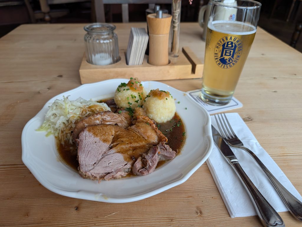 Da ich außer ein paar Datteln noch kein Frühstück hatte und es mittlerweile schon Mittagsessenszeit ist, setze ich mich in ein bayrisches Restaurant und verspeisen einen Braten mit Kartoffelknödel.