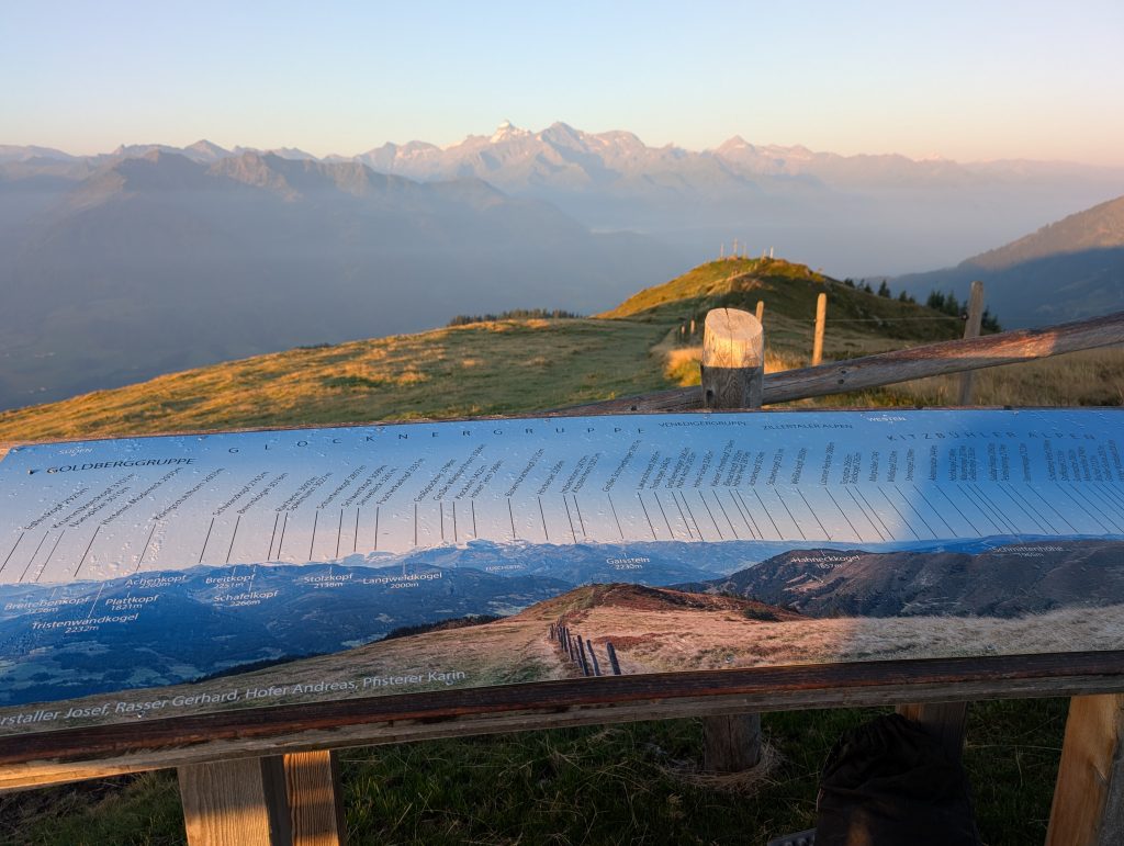 Während mein Zelt am frühen Morgen noch in der aufgehenden Sonne trocknet, betrachte ich mir die Berge um mich herum. Ich erkenne den Großglockner und den Großvenediger, die beide ziemlich einfach zu erkennen sind. Für die meisten anderen Berge muss ich einen Blick auf die Tafel werfen, die eine ganz gute Beschreibung bietet.