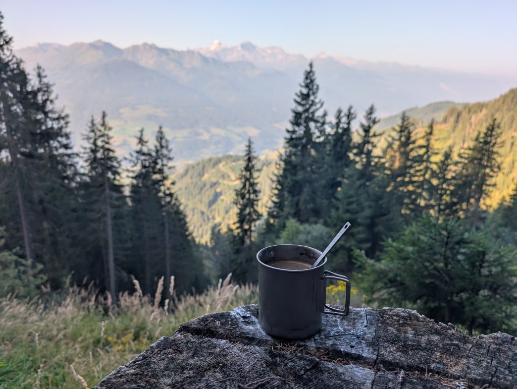 In meinem Zelt habe ich hervorragend geschlafen. Leider ist es am morgen noch feucht und somit muss ich es in der Sonne trocknen, während ich meinen Kaffee trinke.