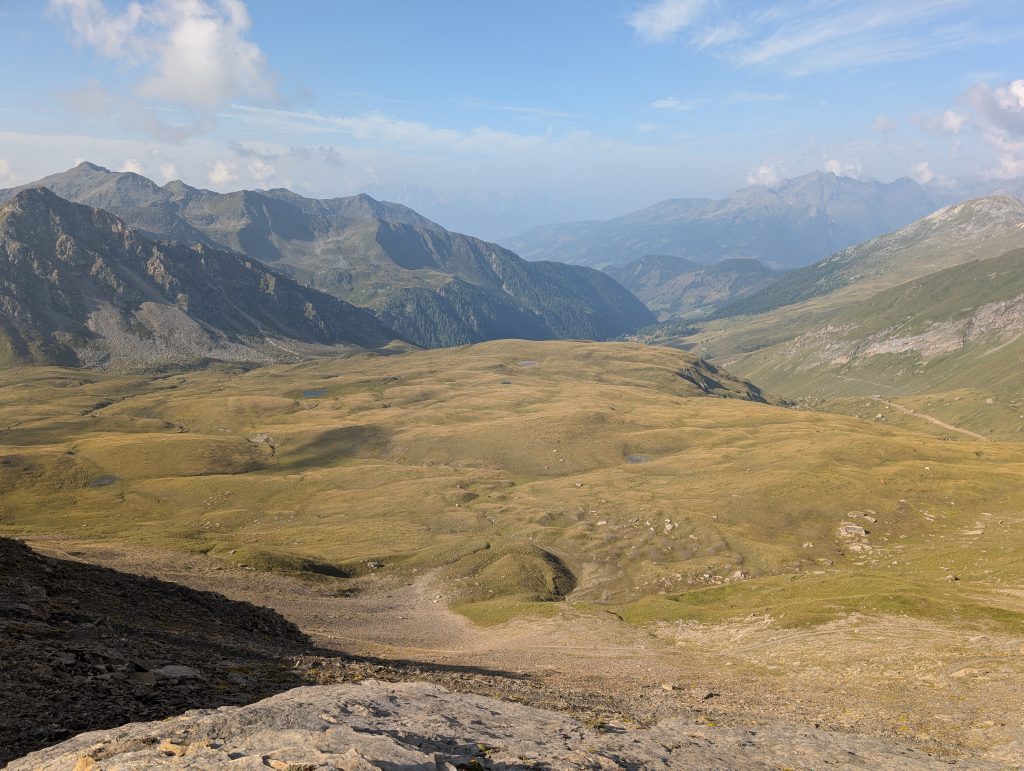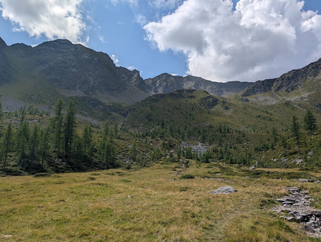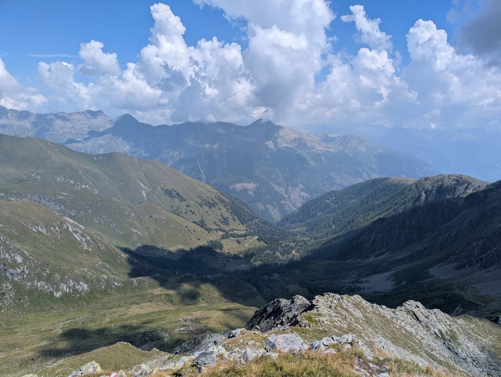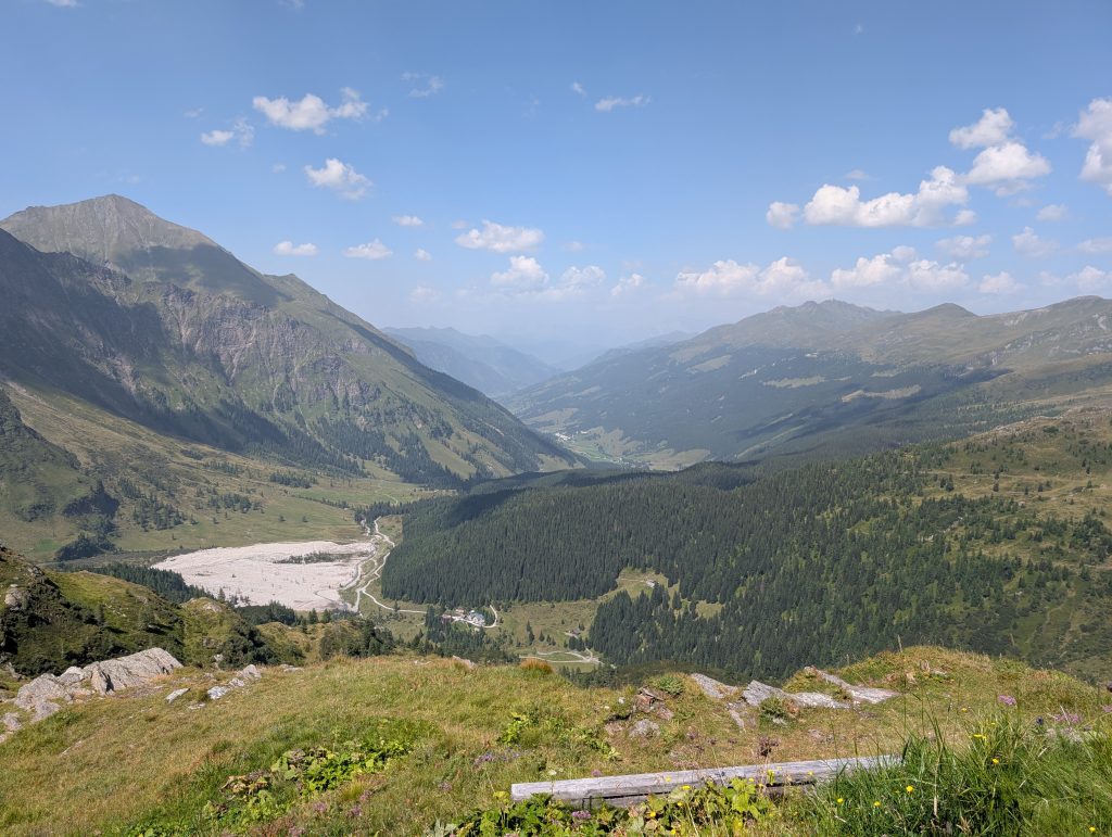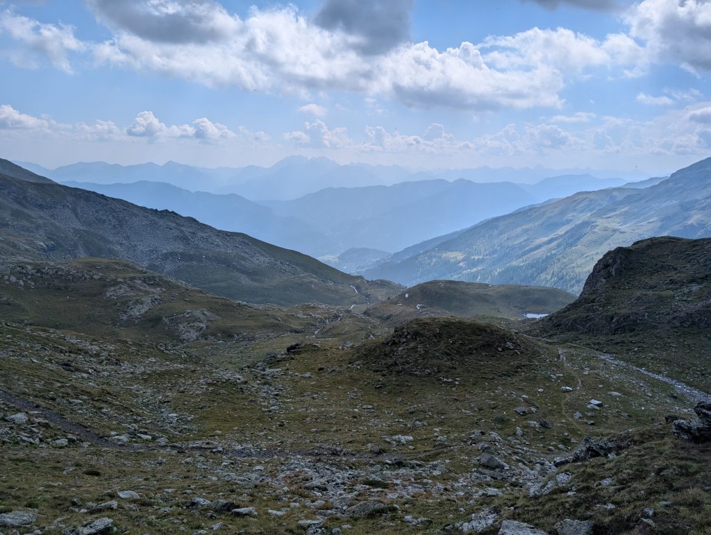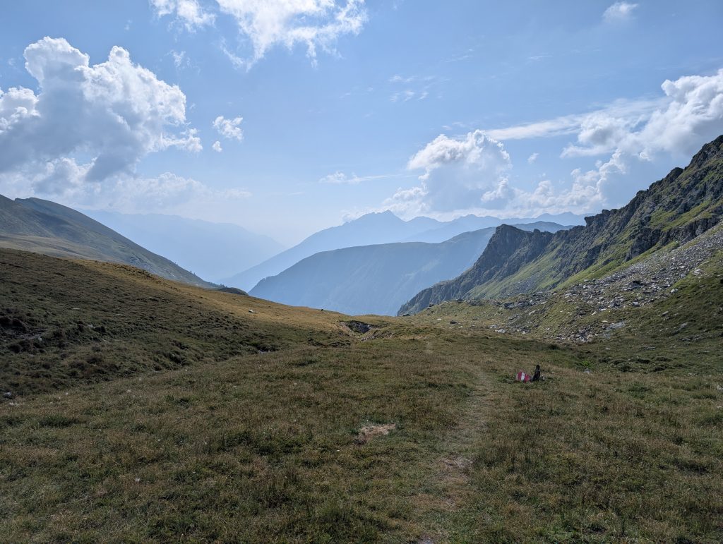 Es folgt ein traumhafter Abstieg über eine sehr ruhige und unberührte Gegenden der Alpen. Weit und breit sind keine Leute zu sehen und es geht über eine sehr ruhige Graslandschaft. Wie ich im Reiseführer gelesen habe, wurde hier in der Gegend (auf dem großen Sadnig) das Ende des Films „7 Jahre in Tibet“ mit Brad Pitt gedreht, wodurch es hier ähnlich aussehen sollte wie in Tibet.