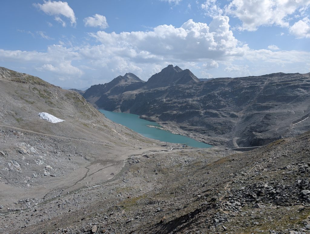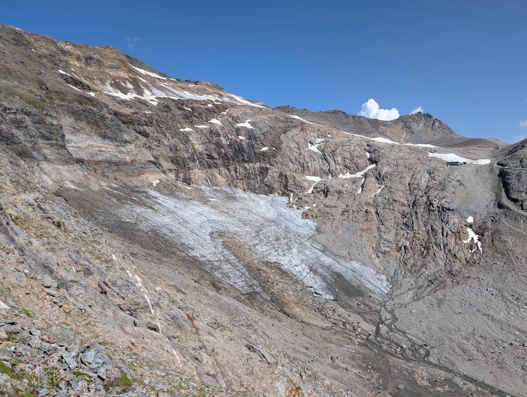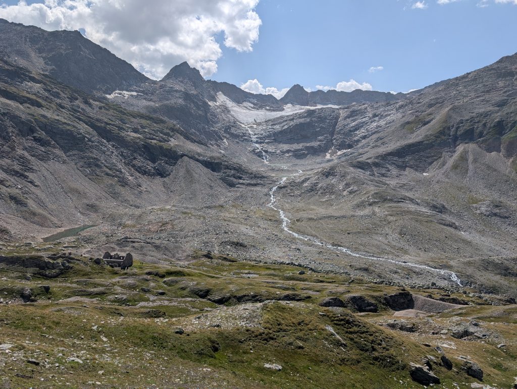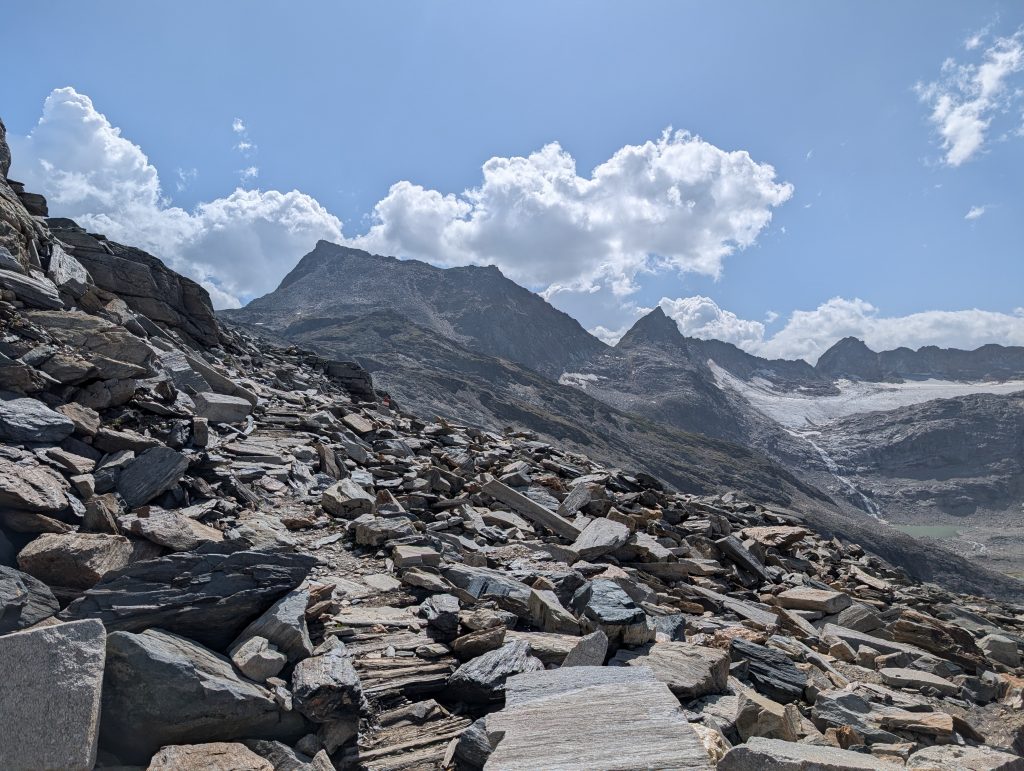 Danach führt mich der Weg weiter über Geröll, bis ich endlich die Fraganter Scharte erreiche. Ich lege nochmals eine kurze Pause ein, esse ein Snickers im Schatten eines Felsens und laufe danach wieder den Berg auf der anderen Seite hinab. Vom Gletscher ist leider nicht mehr viel zu erkennen, dafür sind umso mehr Seilbahnen und Straßen sichtbar, die so gänzlich ohne Schnee ein eher trauriges Bild abgeben.