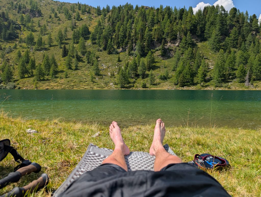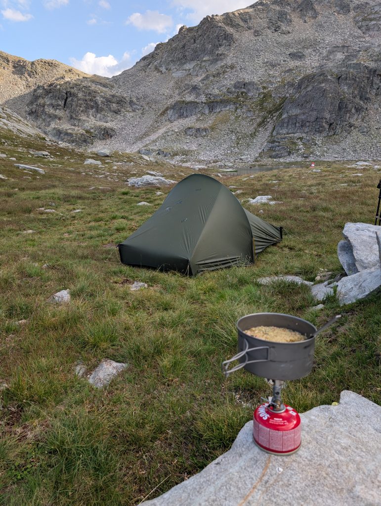 Dort angekommen bin ich über meiner Entscheidung ganz froh. Bis zur nächsten Hütte sind es jeweils knapp zwei Stunden und somit rechne ich um 18 Uhr nicht mehr mit Wanderern, außer eventuell so verrückten wie mir, die auch mal gerne bis 21 Uhr wandern gehen. Aber diese Art von Personen wird mein Zelt sicher nicht stören und somit baue ich bereits kurz nach 18 Uhr mein Zelt nicht weit vom See entfernt auf. Ich koche mir noch mein Abendessen und finde danach endlich Mal wieder Zeit ein bisschen in meinem Zelt zu lesen, bevor ich um kurz vor 21 Uhr dann auch schon schlafen gehe.